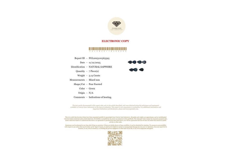3.14 CARATS NATURAL GREEN SAPPHIRE 3.14 Carats Natural SapphireCertificate Number - Fgl2025110365595Color - GreenShape - Pear FacetedDimension - Mixed MmOrigin - N/AComments - Indications Of Heating.Good Quality With Luster Condition: Good - Refer Images 0488433+59