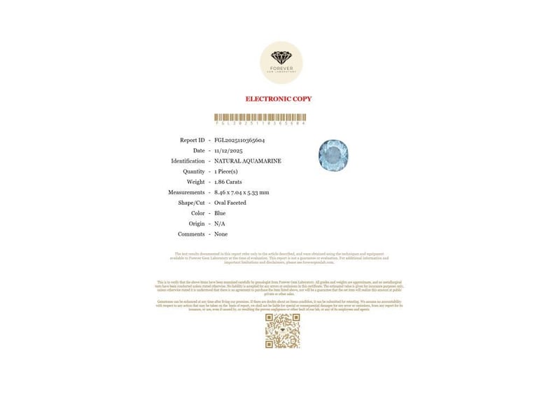 1.86 CARATS NATURAL AQUAMARINE 1.86 Carats Natural AquamarineCertificate Number - Fgl2025110365604Color - BlueShape - Oval FacetedDimension - 8.46 X 7.04 X 5.33 MmOrigin - N/AComments - NoneGood Quality With Luster Condition: Good - Refer Images 0488433+68