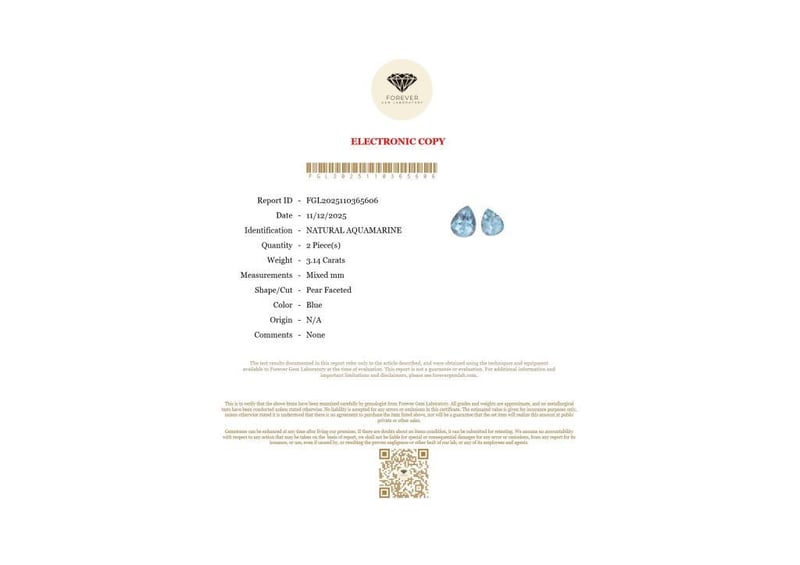 3.14 CARATS NATURAL AQUAMARINE 3.14 Carats Natural AquamarineCertificate Number - Fgl2025110365606Color - BlueShape - Pear FacetedDimension - Mixed MmOrigin - N/AComments - NoneGood Quality With Luster Condition: Good - Refer Images 0488433+70