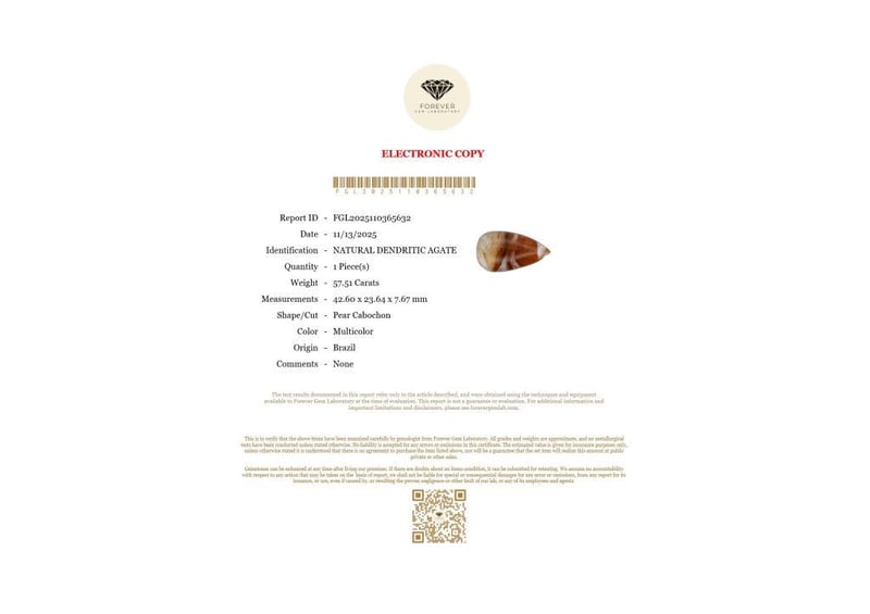 57.51 CARATS NATURAL DENDRITIC AGATE 57.51 Carats Natural Dendritic AgateCertificate Number - Fgl2025110365632Color - MulticolorShape - Pear CabochonDimension - 42.60 X 23.64 X 7.67 MmOrigin - BrazilComments - NoneGood Quality With Luster Condition: Good - Refer Images 0488434+21