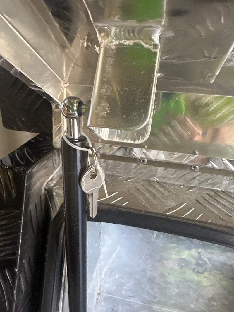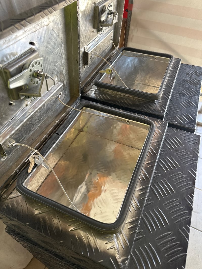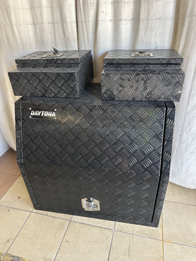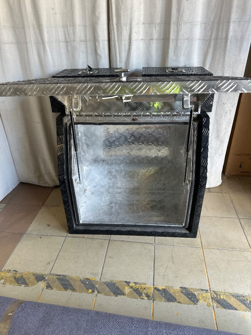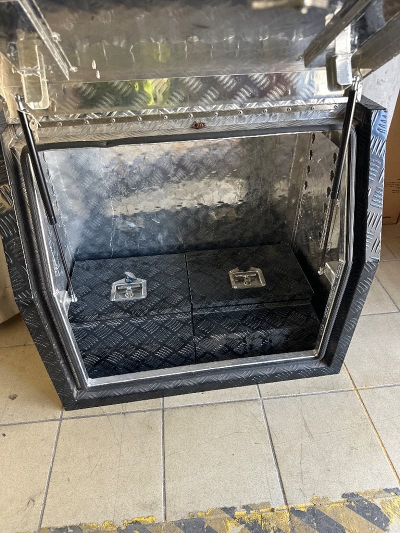 Black powder-coated aluminium checker plate Ute tool box, designed for vehicle storage.
