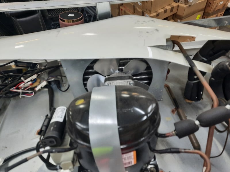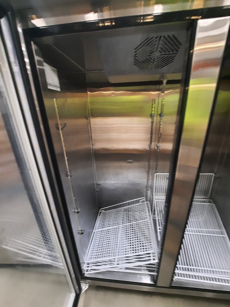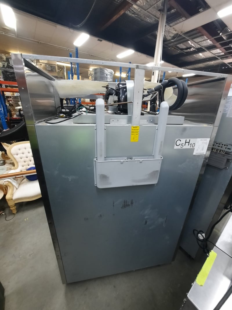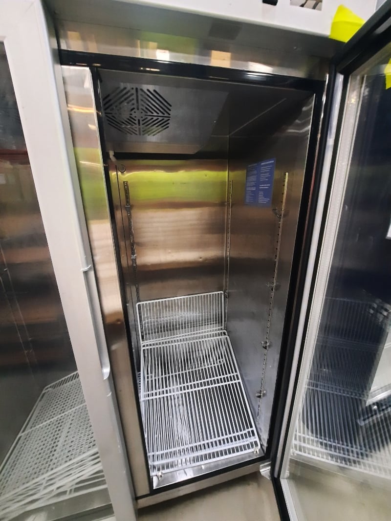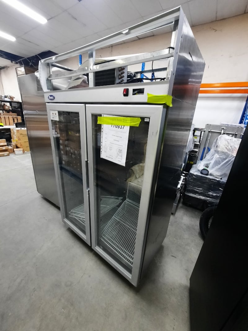 Refrigerated, 2 door, glass door, 1 phase, 10 amp, stainless steel, scratches and dents