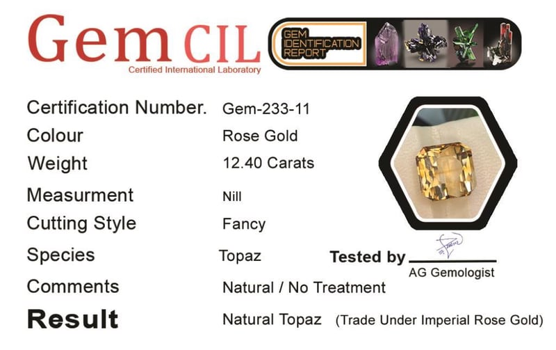 12.40 CARATS NATURAL IMPERIAL ROSE GOLD TOPAZ 12.40 Carats Natural Imperial Rose Gold Topaz Stone = Natural TopazWeight = 12.40 Carats Colour = Rose Gold Cut = Fancy Lustre = Excellent Treatment = Natural, No TreatmentQuality = Vvs (Premium)Note = Precise Custom Cut (Not Commercial)This Natural Topaz Has High Level Of Pleochroism, So Color Intensity Can Vary Upon Different Light Conditions. Condition: Good - Refer Images 0488424+11