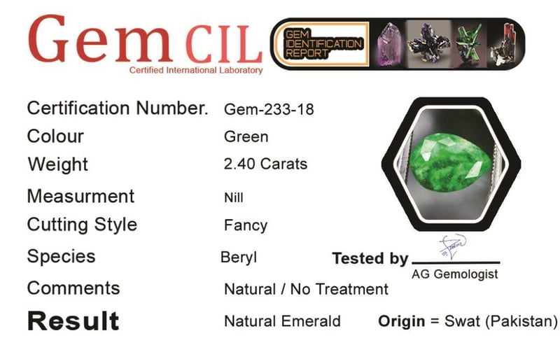 2.40 CARATS NATURAL EMERALD 2.40 Carats Natural Emerald Stone = Natural EmeraldWeight = 2.40 Carats Colour = Green Cut = FancyLustre = Excellent Treatment = No Oil (Natural)Origin = Swat (Pakistan) Condition: Good - Refer Images 0488424+18