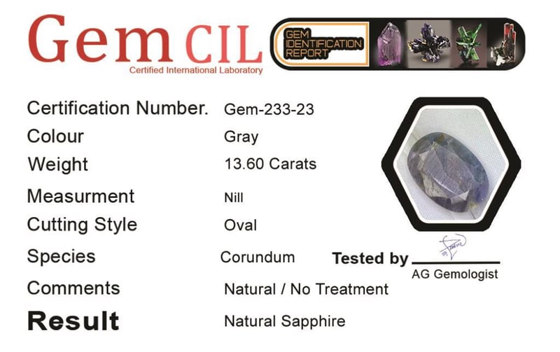 13.60 CARATS NATURAL CERTIFIED SAPPHIRE 13.60 Carats Natural Certified Sapphire Stone = Natural SapphireWeight = 13.60 Carats Cut = Oval Colour = Gray/ BlueLustre = ExcellentTreatment = Natural (No Treatment Detected) Note = Gem Cil, Certified, Precise Custom Cut (Not Commercial) Condition: Good - Refer Images 0488424+23