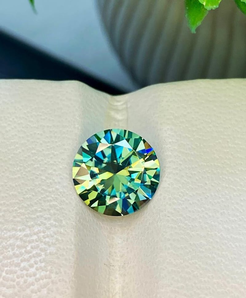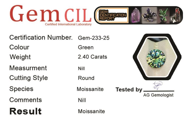 2.40 CARATS SPARKLING MOISSANITE 2.40 Carats Sparkling MoissaniteStone = MoissaniteWeight = 2.40 Carats Colour = GreenCut = RoundLustre = ExcellentNote = Gem Cil, Certified, Condition: Good - Refer Images 0488424+25
