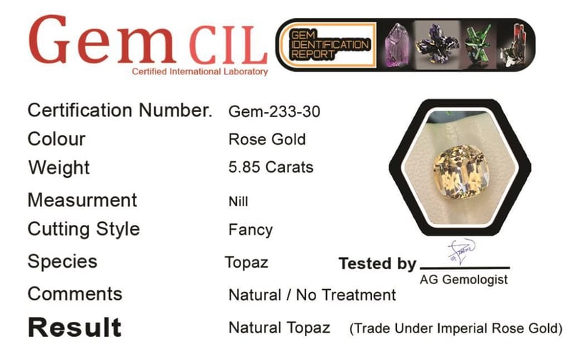 5.85 CARATS NATURAL IMPERIAL ROSE GOLD TOPAZ 5.85 Carats Natural Imperial Rose Gold Topaz Stone = Natural TopazWeight = 5.85 Carats Colour = Rose Gold Cut = Fancy Lustre = Excellent Treatment = Natural, No TreatmentQuality = Vvs (Premium)Note = Precise Custom Cut (Not Commercial)This Natural Topaz Has High Level Of Pleochroism, So Color Intensity Can Vary Upon Different Light Conditions. Condition: Good - Refer Images 0488424+30