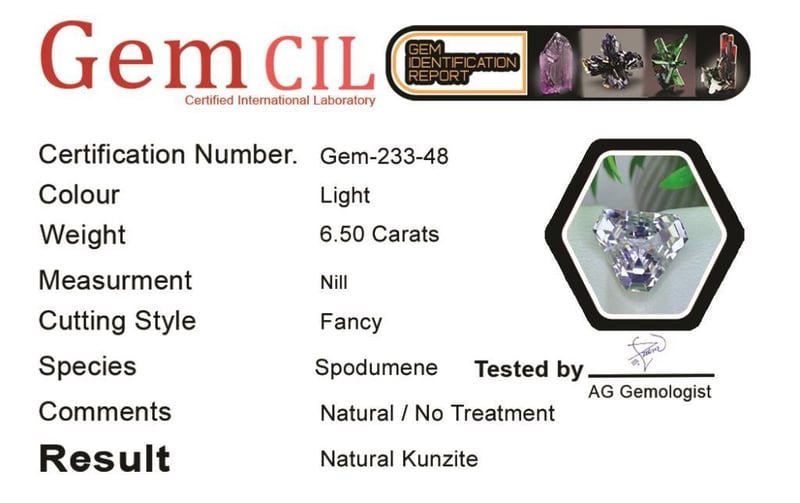 6.50 CARATS NATURAL KUNZITE 6.50 Carats Natural Kunzite Stone = Natural KunziteWeight = 6.50 Carats Colour = LightCut = Fancy Lustre = ExcellentNote = Gem Cil, Certified, Precise Custom Cut (Not Commercial) Condition: Good - Refer Images 0488424+48
