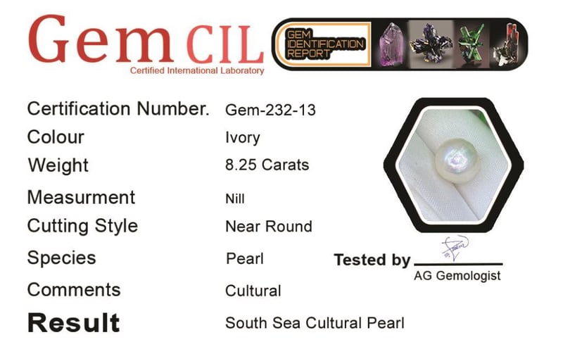 8.25 CARATS SOUTH SEA PEARL 8.25 Carats South Sea Pearl Stone = South Sea Pearl Weight = 8.25 Carats Colour = IvoryTreatment = CulturalNote = Gem Cil, Certified, Condition: Good - Refer Images 0488429+13