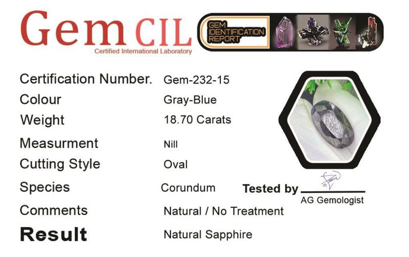 18.70 CARATS NATURAL CERTIFIED SAPPHIRE 18.70 Carats Natural Certified Sapphire Stone = Natural SapphireWeight = 18.70 Carats Cut = Oval Colour = Blue/GrayLustre = ExcellentTreatment = Natural (No Treatment Detected) Note = Gem Cil, Certified, Precise Custom Cut (Not Commercial) Condition: Good - Refer Images 0488429+15