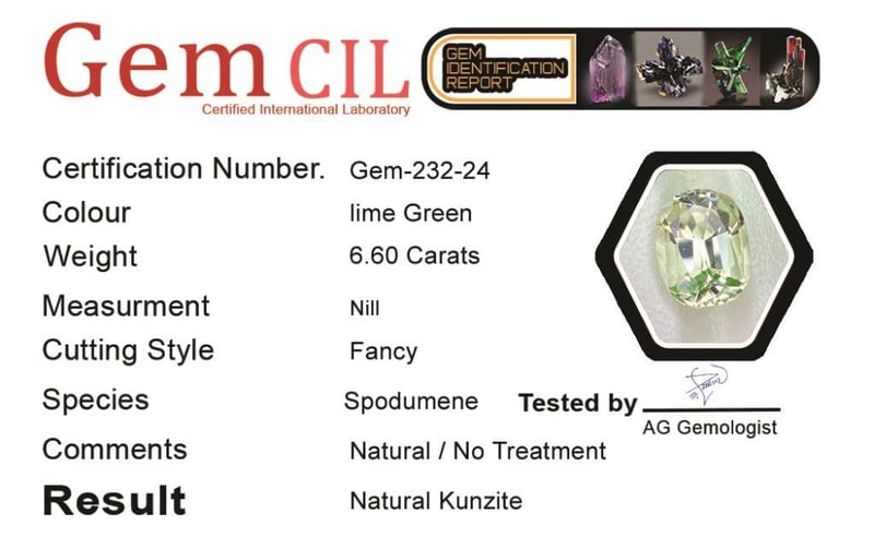 6.60 CARATS NATURAL KUNZITE 6.60 Carats Natural Kunzite Stone = Natural KunziteWeight = 6.60 Carats Colour = PaleCut = Fancy Lustre = ExcellentNote = Gem Cil, Certified, Precise Custom Cut (Not Commercial) Condition: Good - Refer Images 0488429+24