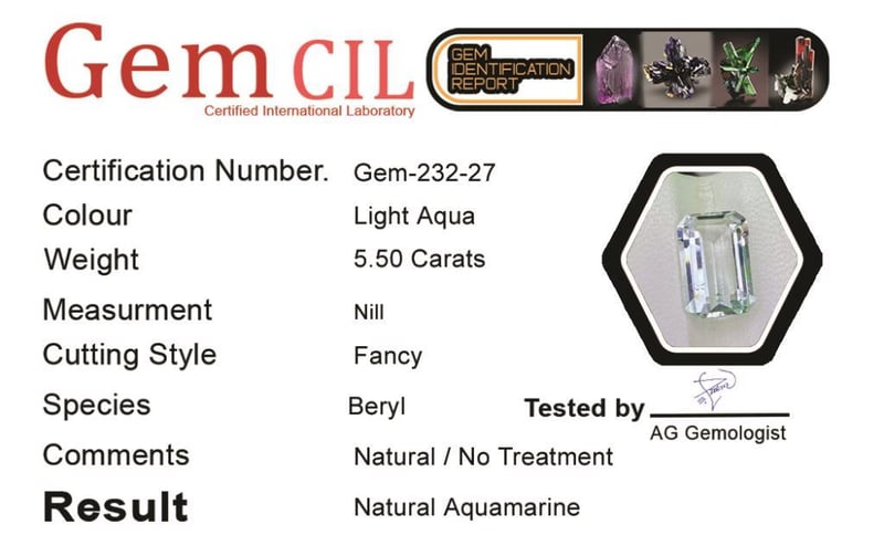 5.50 CARATS NATURAL QUALITY AQUAMARINE 5.50 Carats Natural Quality AquamarineStone = Natural AquamarineWeight = 5.50 Carats Cut = FancyColour = PaleQuantity = 1Note = Gem Cil, Certified, Condition: Good - Refer Images 0488429+27
