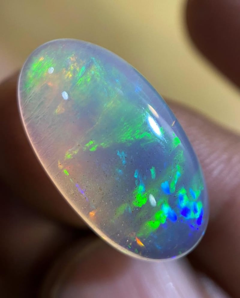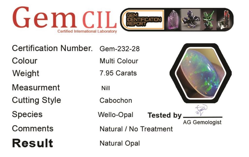 7.95 CARATS NATURAL FIERY WELLO OPAL 7.95 Carats Natural Fiery Wello OpalStone = Natural OpalWeight = 7.95 Carats Colour = Multi ColourCut = Cabochon Treatment = Natural, No TreatmentNote = Gem Cil, Certified Pic Taken Under Light Condition: Good - Refer Images 0488429+28