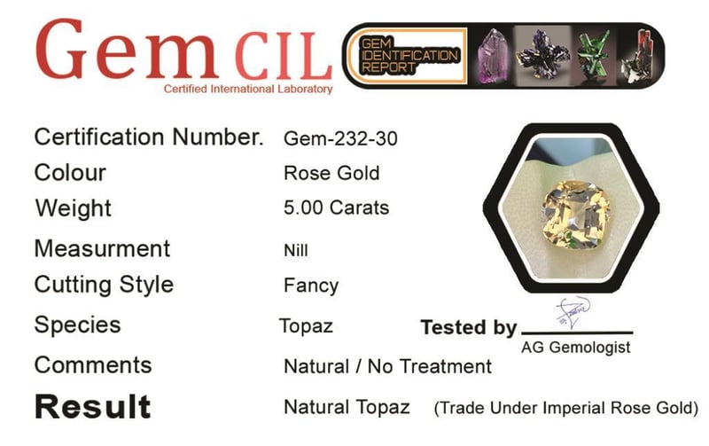 5.00 CARATS NATURAL IMPERIAL ROSE GOLD TOPAZ 5.00 Carats Natural Imperial Rose Gold Topaz Stone = Natural TopazWeight = 5.00 Carats Colour = Rose Gold Cut = Fancy Lustre = Excellent Treatment = Natural, No TreatmentQuality = Vvs (Premium)Note = Precise Custom Cut (Not Commercial)This Natural Topaz Has High Level Of Pleochroism, So Color Intensity Can Vary Upon Different Light Conditions. Condition: Good - Refer Images 0488429+30
