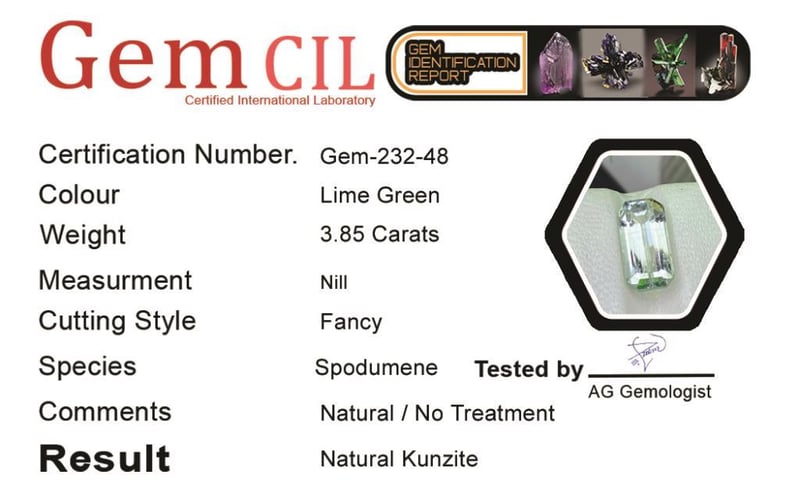 3.85 CARATS NATURAL KUNZITE 3.85 Carats Natural Kunzite Stone = Natural KunziteWeight = 3.85 Carats Colour = Lime GreenCut = Fancy Lustre = ExcellentNote = Gem Cil, Certified, Precise Custom Cut (Not Commercial) Condition: Good - Refer Images 0488429+48