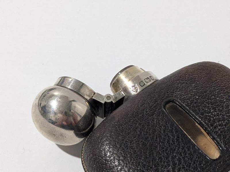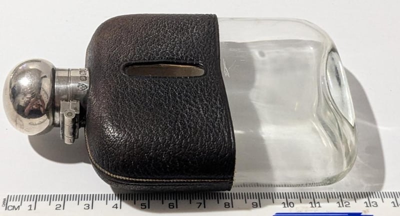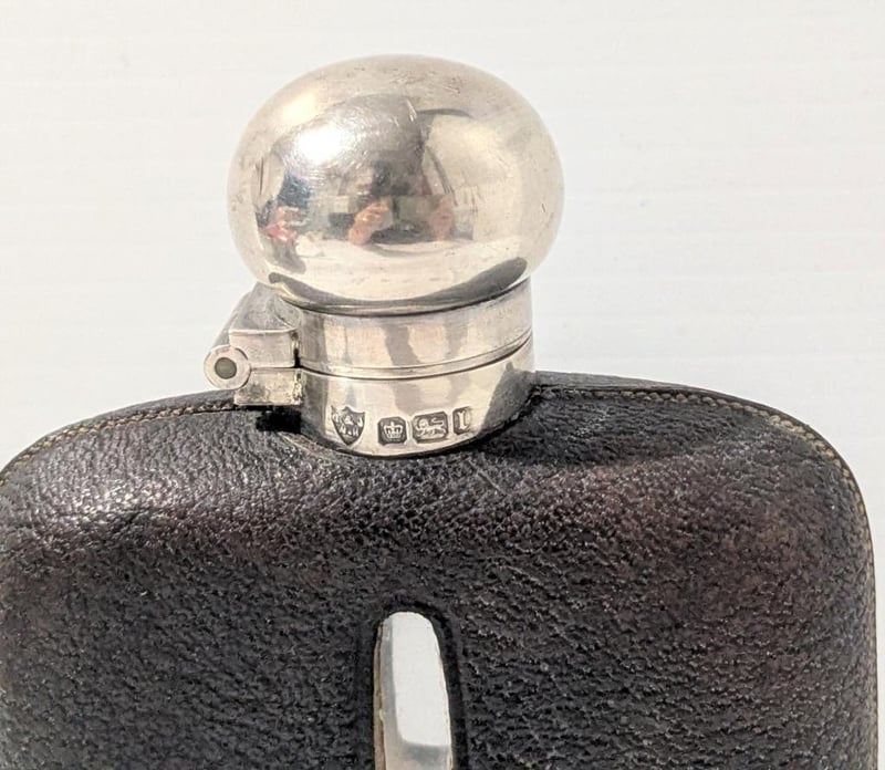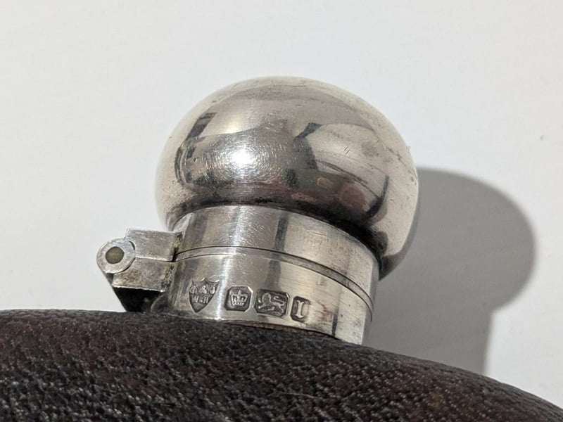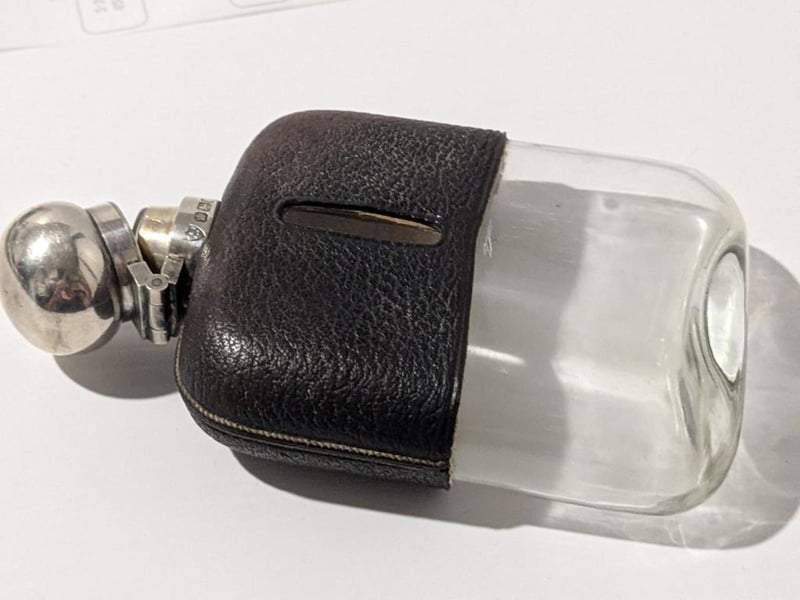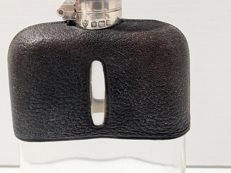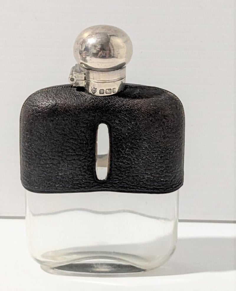VINTAGE GLASS DRINKING FLASK WITH STERLING SILVER TOP & LEATHERAssay Mark Of Lion For Sheffield, 12.5Cm TallCondition: Good - Refer To Images586311+10