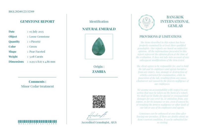 3.08 CARATS CERTIFIED NATURAL EMERALD Gemstone : Natural EmeraldCertificate Number : Bigl20240122132309Weight : 3.08 CaratsColor : GreenMeasurement : 11.93 X 8.67 X 4.86 MmShape : Pear FacetedQuantity : 1 PieceOrigin : ZambiaComments : Minor Cedar Treatment• Use The Qr Code On The Packaging To View And Download The Certificate. • Verify Report Online At Www.Bangkokinternationalgemlab.Co Condition: Good - Refer Images 01611158+40