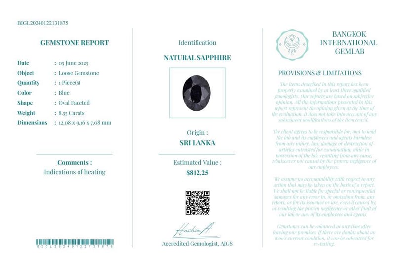 8.55 CARATS CERTIFIED NATURAL SAPPHIRE Gemstone : Natural SapphireCertificate Number : Bigl20240122131875Weight : 8.55 CaratsColor : BlueMeasurement : 12.08 X 9.16 X 7.08 MmShape : Oval FacetedQuantity : 1 PieceOrigin : Sri LankaComments : Indications Of Heating• Use The Qr Code On The Packaging To View And Download The Certificate. • Verify Report Online At Www.Bangkokinternationalgemlab.Co Condition: Good - Refer Images 01611159+11