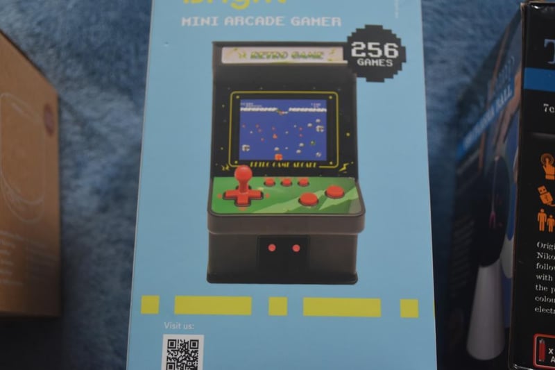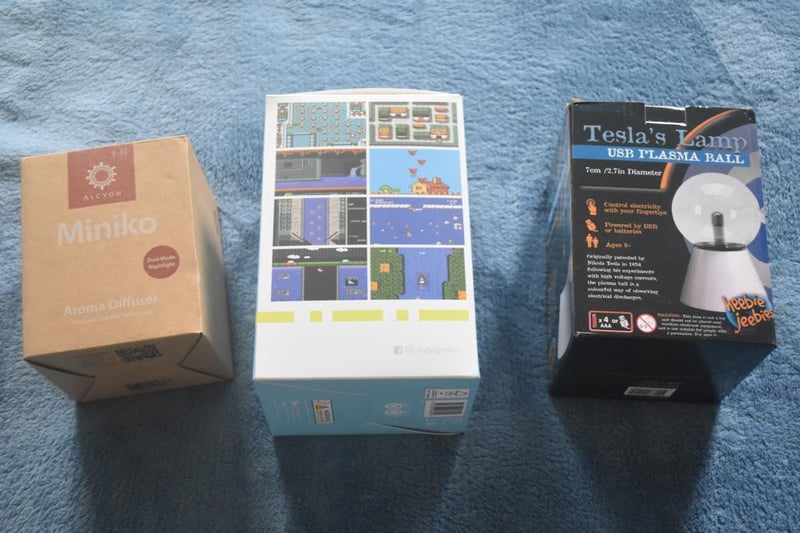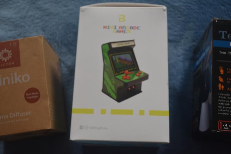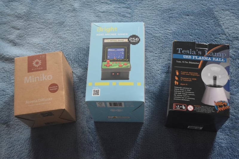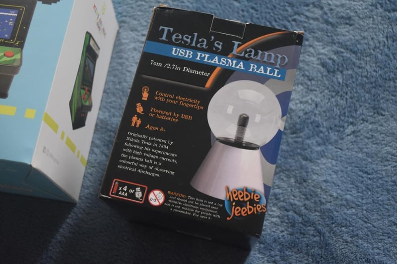 Retro Arcade Gamer with 256 Games, accessories including AV cable to connect to TV set, USB charging cable, New in Box, Tesla PLasma Ball lamp, Minoko Aroma Diffuser, in Box.