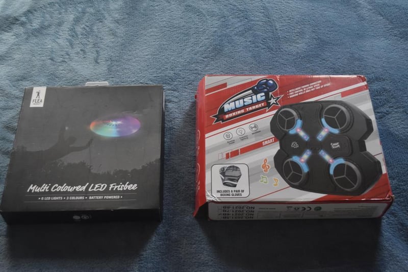 Multicoloured LED Frisbee and electronic Boxing Pad, in Box.