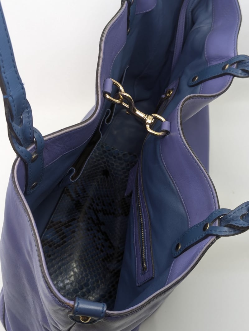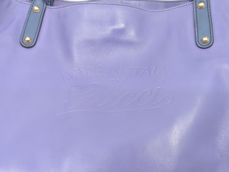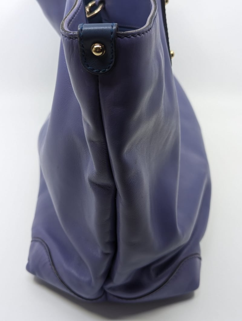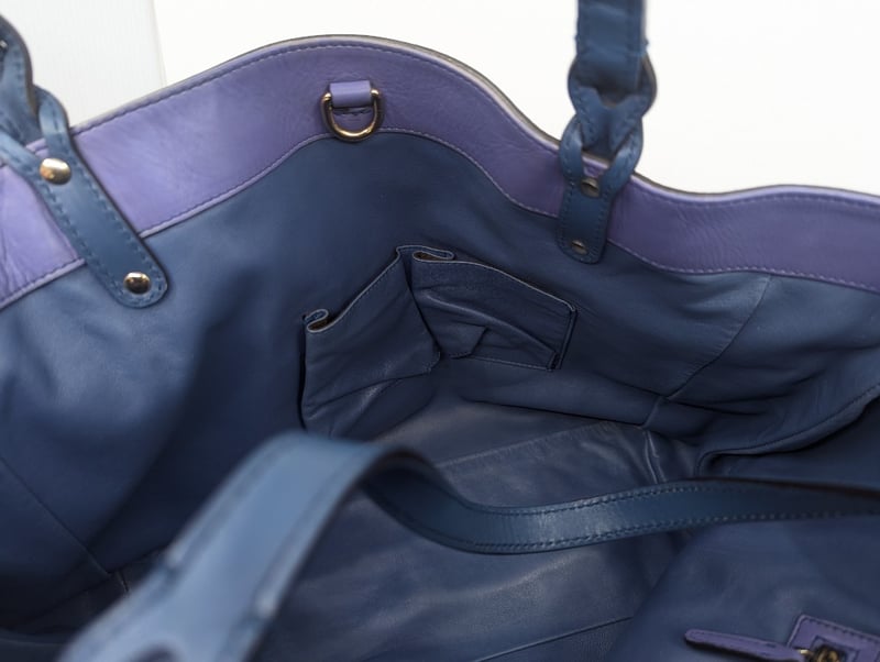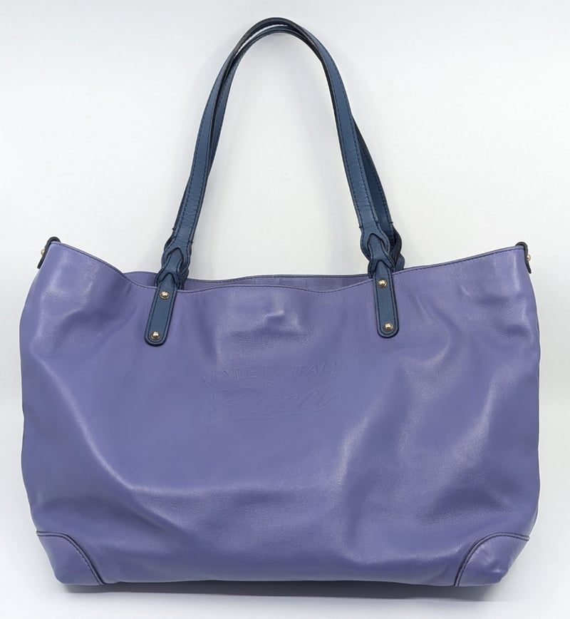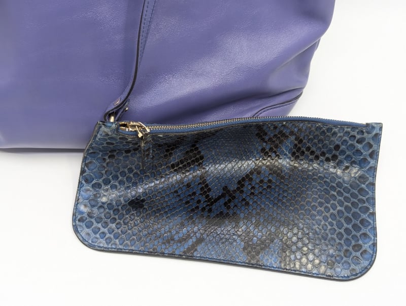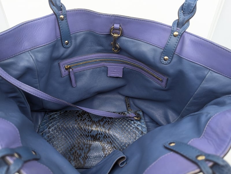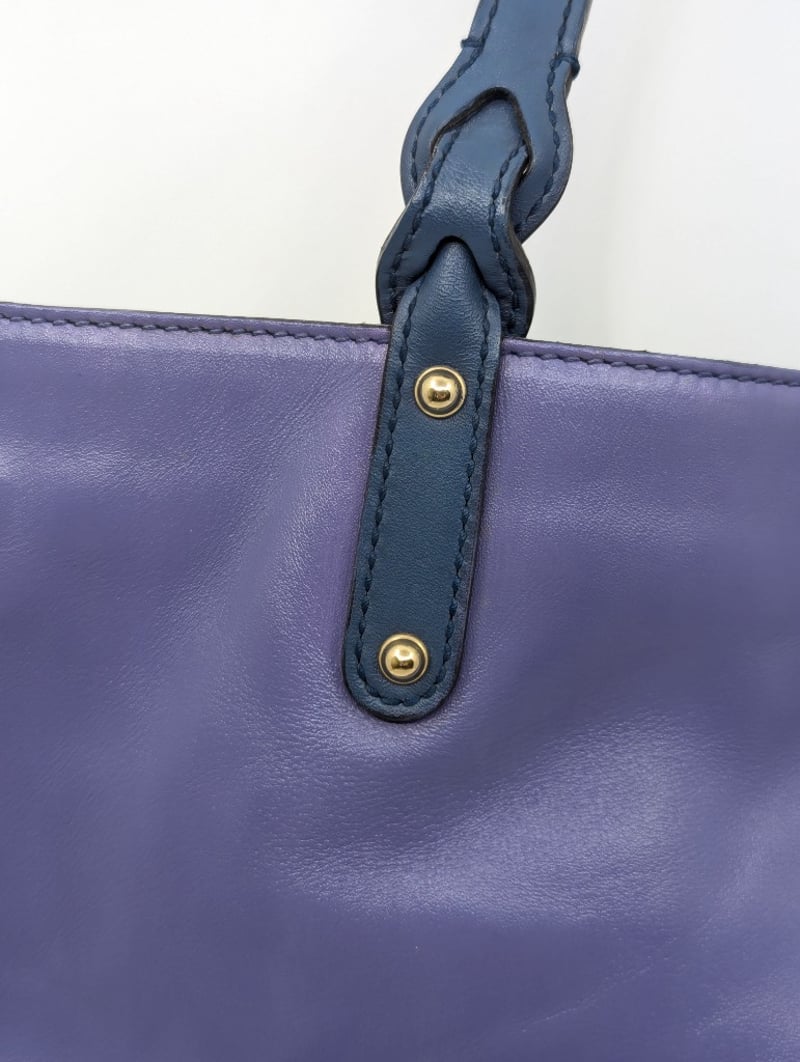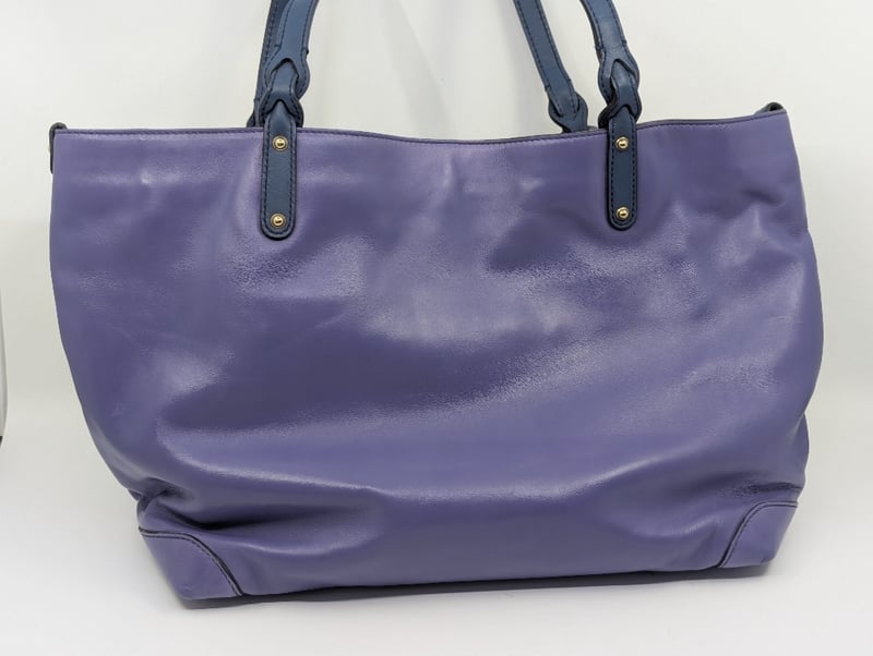 Purple Leather Style Exterior, Dual Carry Handles, Interior Clutch Wallet, Single Main Compartment With Two Inner Pockets And One Interior Zip Pocket, Includes Dust Bag