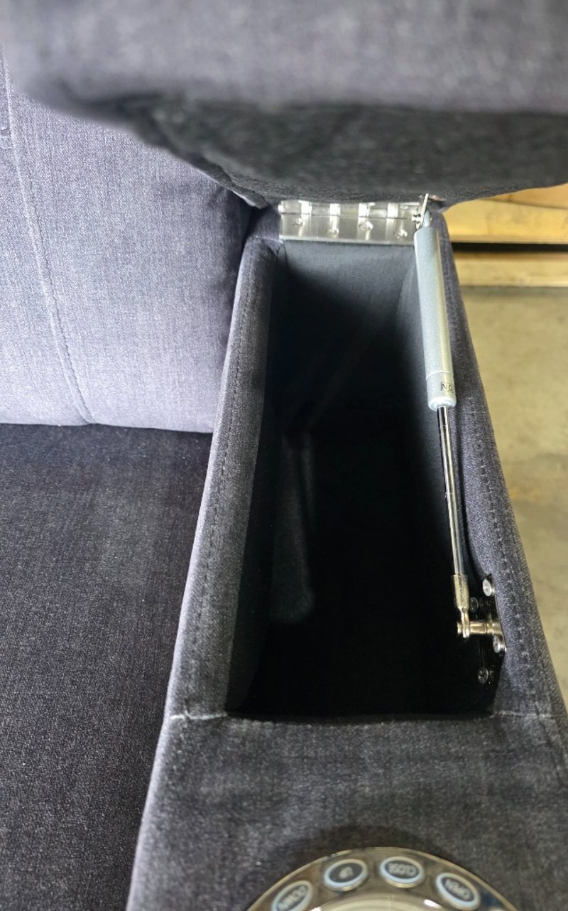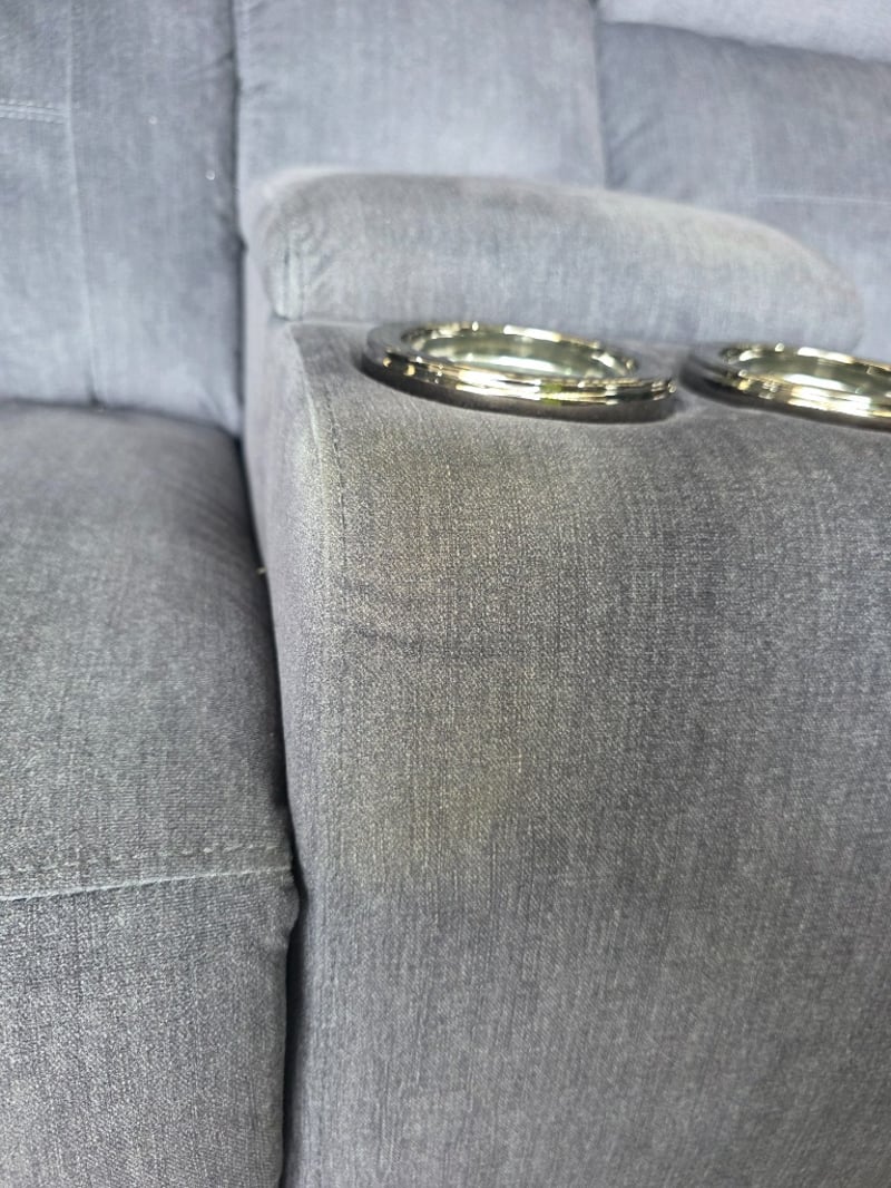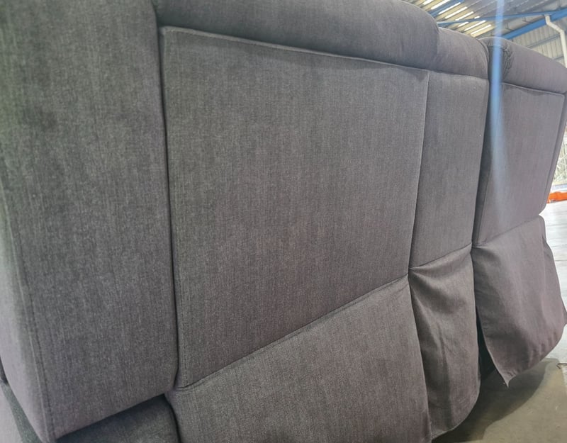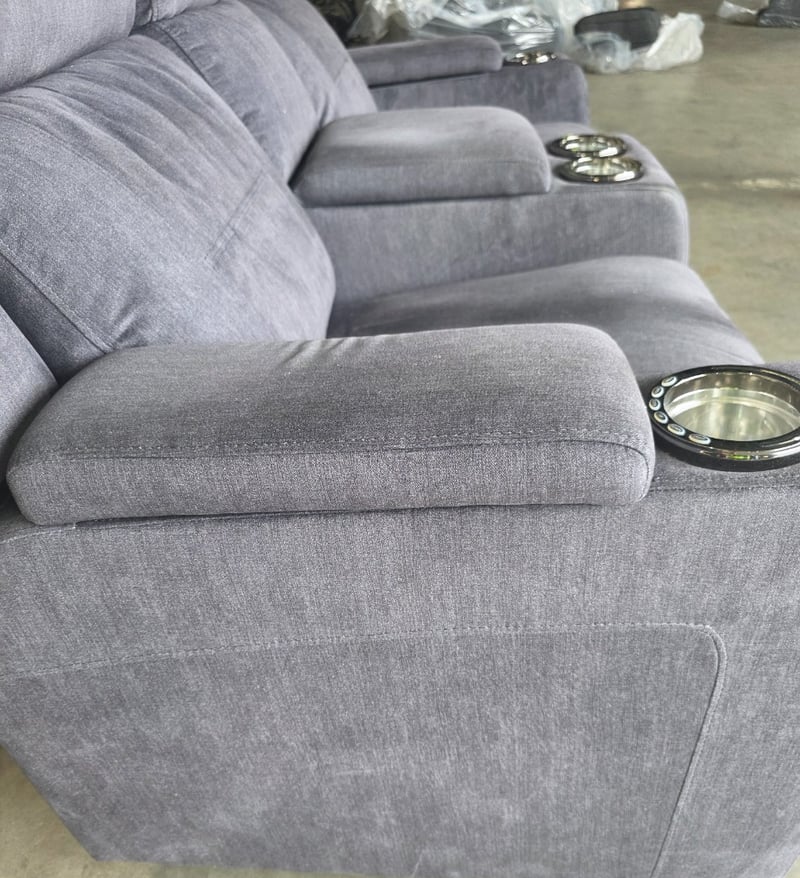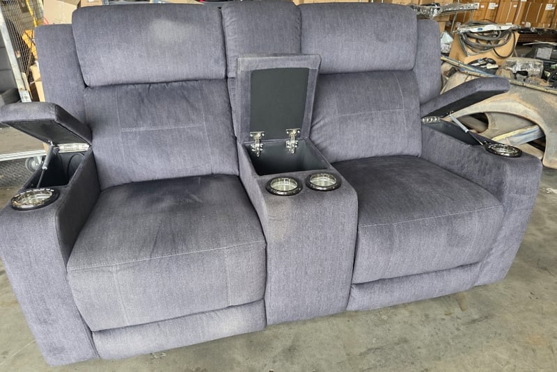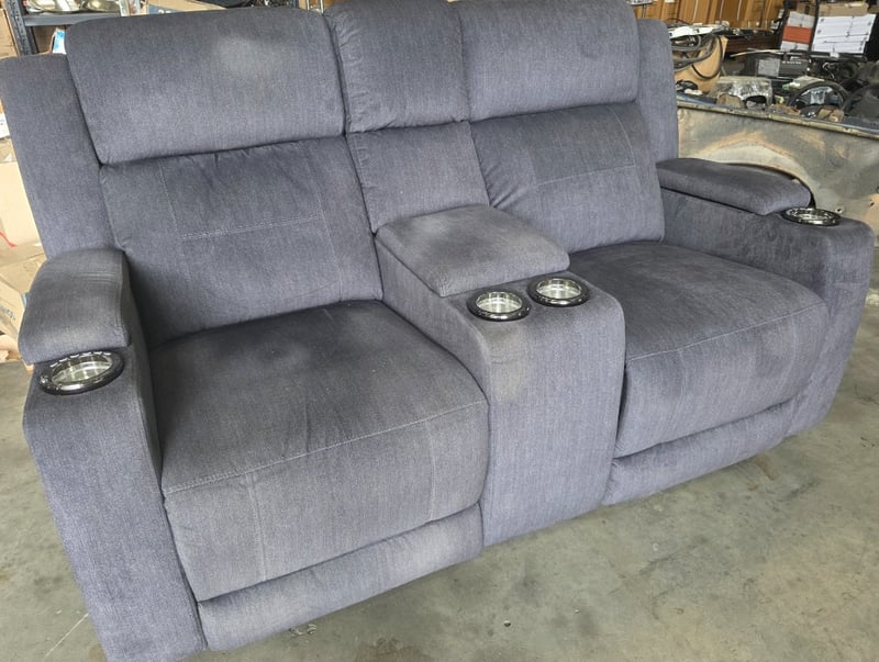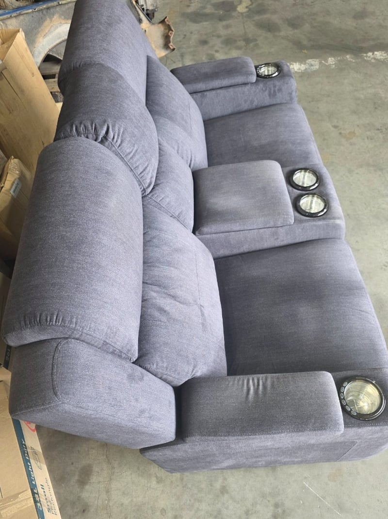 1 piece Leman ebony coloured two seater electric reclining couch. Featuring cupholders, gas lift armrests with storage and a middle compartment. Dimensions: 166cm(L), 100cm(W), 90cm(H)Inspection recommended.Slight stains on fabric and use.