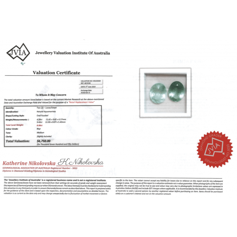 8.00CT TSW X 2, NATURAL AQUAMARINES Oval Faceted Cut, Medium Blue, Slightly Included, Loose, Unset. Valuations Provided by an Independent Third-Party Professional Not Directly Associated With Lloyds Auctions at AUD $$6,750.00This valuation has been conducted by an independent third-party professional. The valuation amount is an assessment by the issuing valuer and does not reflect the auction value of the item. Any inquiries regarding the valuation should be directed to the issuing valuer (refer to contact details on the certificate), as Lloyds Auctions has no affiliation or influence over the valuation, the valuer, or the stated amount. Condition: Good - Refer Images 0645920+2174