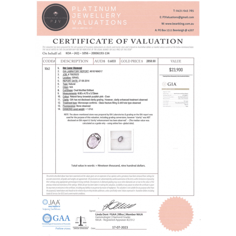 1.01CT CERTIFIED, NATURAL FANCY PURPLE DIAMOND Oval Modified Brilliant Cut, Fancy Brownish Purple-Pink, Loose, Unset. Stone Comes With Gia Report: 6167484017. Valuations Provided by an Independent Third-Party Professional Not Directly Associated With Lloyds Auctions at AUD $$23,900.00This valuation has been conducted by an independent third-party professional. The valuation amount is an assessment by the issuing valuer and does not reflect the auction value of the item. Any inquiries regarding the valuation should be directed to the issuing valuer (refer to contact details on the certificate), as Lloyds Auctions has no affiliation or influence over the valuation, the valuer, or the stated amount. Condition: Good - Refer Images 0645920+2175