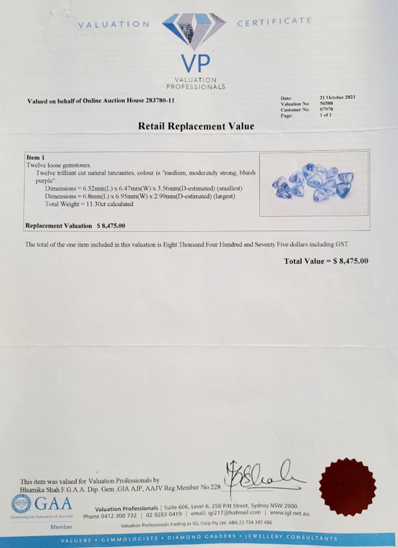 11.30CTS TCW TRILLIANT CUT TANZANITE GEMSTONESCondition: Good - Refer To ImagesThis valuation has been conducted by an independent third-party professional. The valuation amount is an assessment by the issuing valuer and does not reflect the auction value of the item.Any inquiries regarding the valuation should be directed to the issuing valuer (refer to contact details on the certificate), as Lloyds Auctions has no affiliation or influence over the valuation, the valuer, or the stated amount.Insurance Replacement Valuation Amount: $8,475.00488436+9