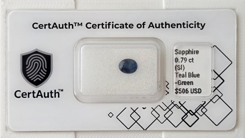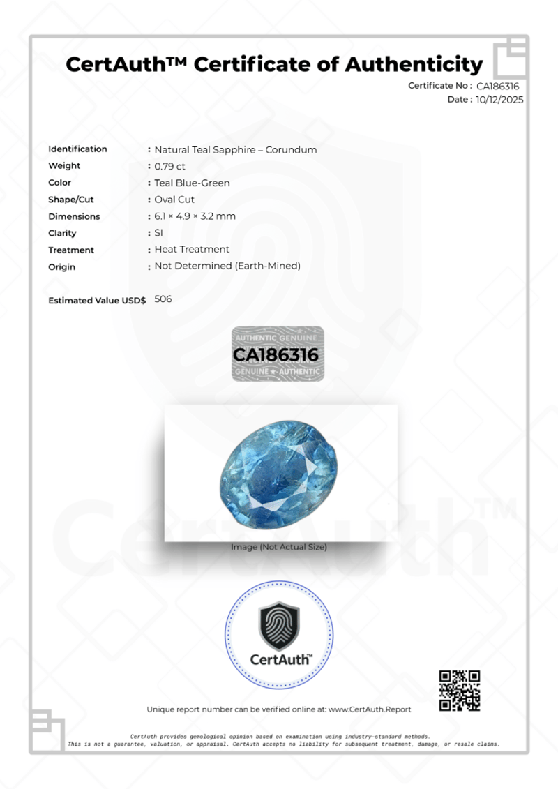 A Natural 0.79-Carat Teal Sapphire Displaying An Attractive Teal Blue-Green Colour. This Oval Cut Gemstone Exhibits Si Clarity And Has Undergone Standard Heat Treatment. An Earth-Mined Sapphire, Securely Sealed In A Certauth™ Securecard And Accompanied By A Digital Certificate Of Authenticity.