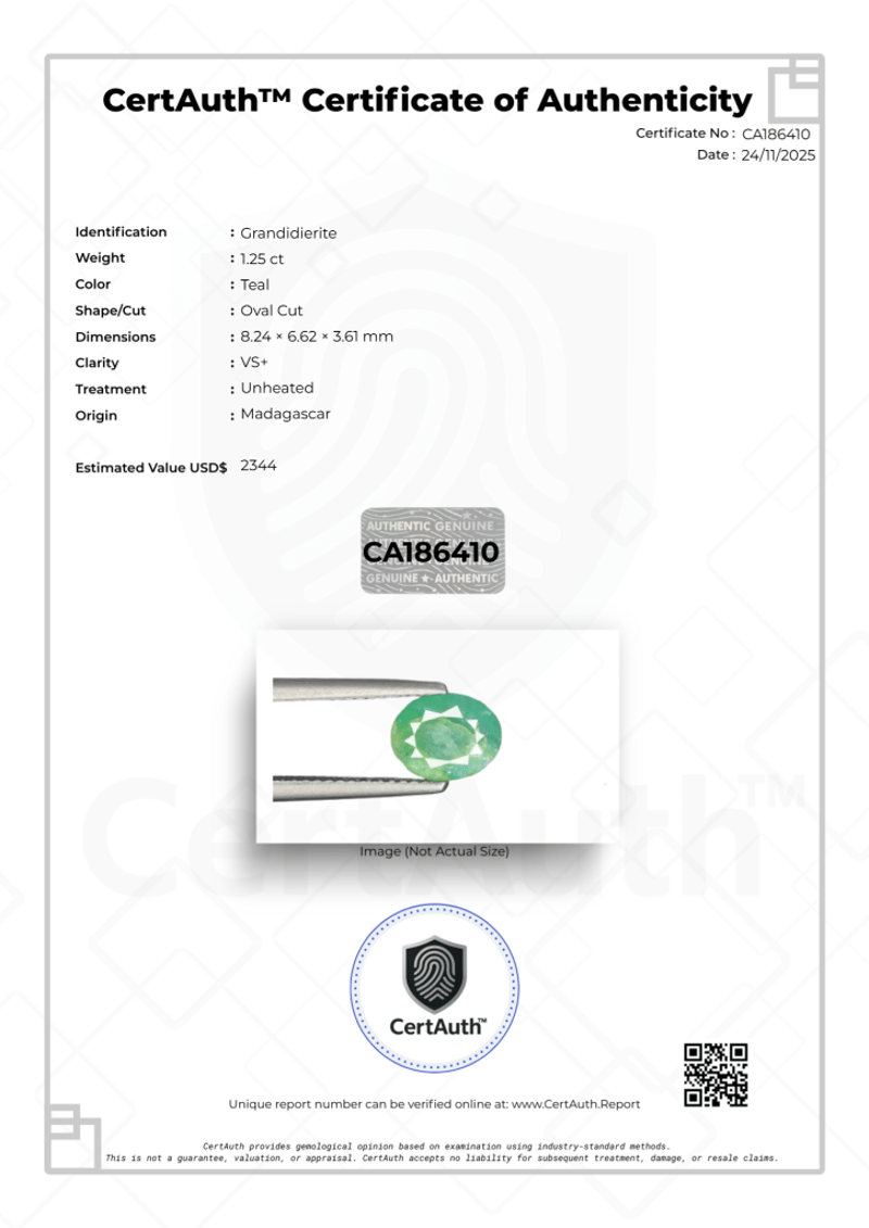 1.25 CT OVAL CUT TEAL GRANDIDIERITE – VS+ CLARITY A Natural 1.25-Carat Grandidierite Displaying An Attractive Teal Colour. This Oval Cut Gemstone Features Bright Vs+ Clarity And Is Completely Unheated. Sourced From Madagascar, This Earth-Mined Grandidierite Is Securely Sealed In A Certauth™ Securecard And Accompanied By A Digital Certificate Of Authenticity.Details:• Gemstone: Grandidierite• Carat Weight: 1.25 Ct• Colour: Teal• Cut: Oval Cut• Clarity: Vs+• Treatment: Unheated• Dimensions: 8.24 × 6.62 × 3.61 Mm• Origin: Madagascar• Certification: Certauth Digital Certificate (No: Ca186410)• Estimated Value: $2,344 UsdNote: The Gemstone Is Securely Sealed In Original Certauth™ Securecard Packaging. Condition: Good - Refer Images 0488440+6