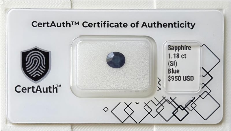 1.18 CT OVAL CUT BLUE SAPPHIRE – SI CLARITY A Natural 1.18-Carat Blue Sapphire Displaying A Classic Deep Blue Colour. This Oval Cut Gemstone Features Si Clarity And Has Undergone Standard Heat Treatment. An Earth-Mined Sapphire, Securely Sealed In A Certauth™ Securecard And Accompanied By A Digital Certificate Of Authenticity.Details:• Gemstone: Sapphire – Corundum• Carat Weight: 1.18 Ct• Colour: Blue• Cut: Oval Cut• Clarity: Si• Treatment: Heat Treatment• Dimensions: 6.6 × 5.7 × 3.7 Mm• Origin: Not Determined (Earth-Mined)• Certification: Certauth Digital Certificate (No: Ca186302)• Estimated Value: $950 UsdNote: The Gemstone Is Securely Sealed In Original Certauth™ Securecard Packaging. Condition: Good - Refer Images 0488440+7