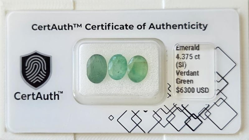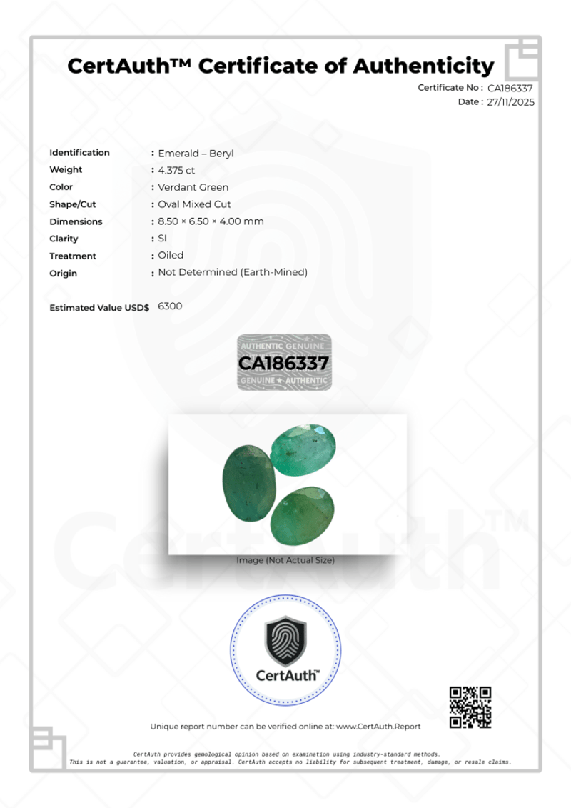 4.375 CT OVAL MIXED CUT VERDANT GREEN EMERALD – SI CLARITY A Natural 4.375-Carat Emerald Displaying A Rich Verdant Green Colour. This Oval Mixed Cut Gemstone Features Si Clarity And Has Been Traditionally Oiled. An Earth-Mined Beryl, Securely Sealed In A Certauth™ Securecard And Accompanied By A Digital Certificate Of Authenticity.Details:• Gemstone: Emerald – Beryl• Carat Weight: 4.375 Ct• Colour: Verdant Green• Cut: Oval Mixed Cut• Clarity: Si• Treatment: Oiled• Dimensions: 8.50 × 6.50 × 4.00 Mm• Origin: Not Determined (Earth-Mined)• Certification: Certauth Digital Certificate (No: Ca186337)• Estimated Value: $6,300 UsdNote: The Gemstone Is Securely Sealed In Original Certauth™ Securecard Packaging. Condition: Good - Refer Images 0488440+10