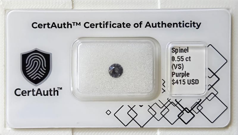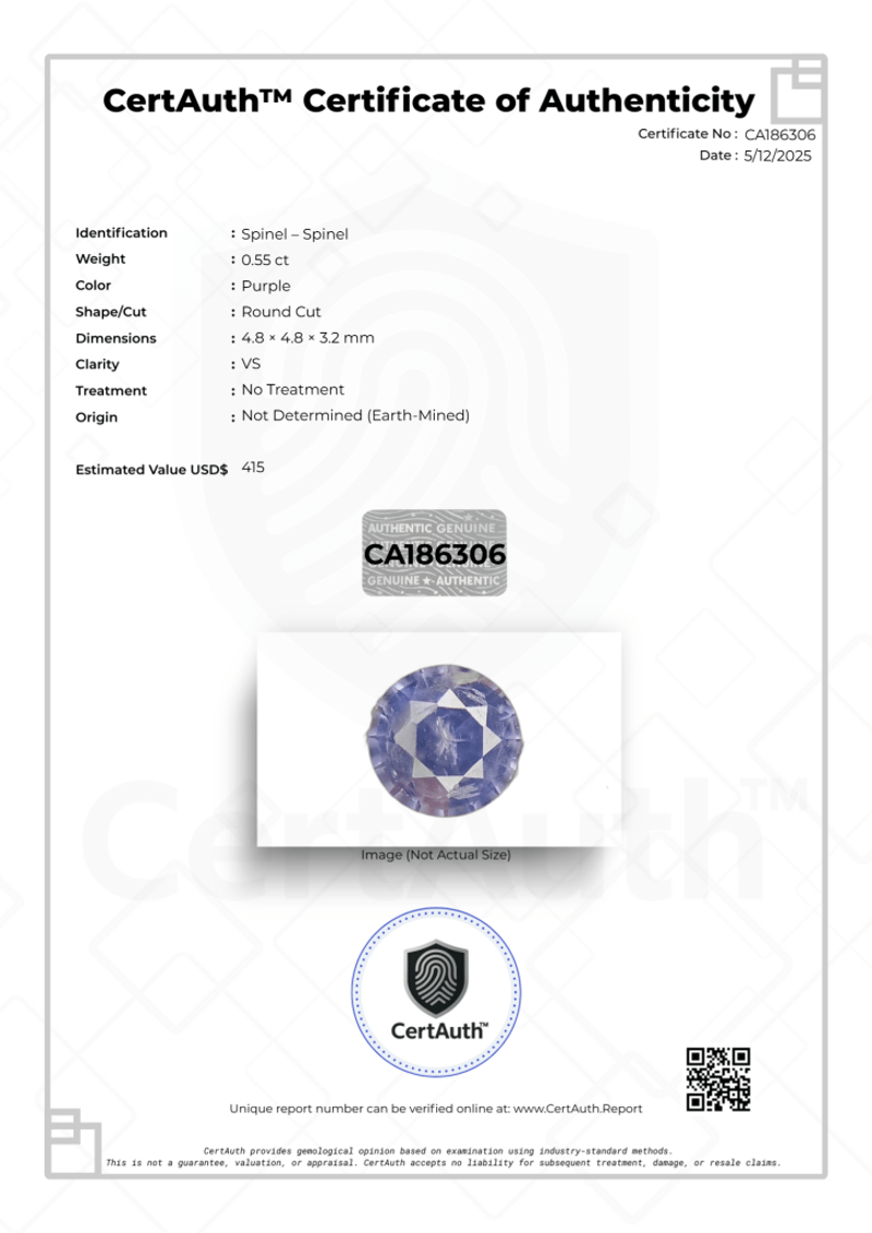 0.55 CT ROUND CUT PURPLE SPINEL – VS CLARITY A Natural 0.55-Carat Purple Spinel Displaying A Soft Purple Hue. This Round Cut Gemstone Features Clean Vs Clarity And Has Received No Treatment. An Earth-Mined Spinel, Securely Sealed In A Certauth™ Securecard And Accompanied By A Digital Certificate Of Authenticity.Details:• Gemstone: Spinel• Carat Weight: 0.55 Ct• Colour: Purple• Cut: Round Cut• Clarity: Vs• Treatment: No Treatment• Dimensions: 4.8 × 4.8 × 3.2 Mm• Origin: Not Determined (Earth-Mined)• Certification: Certauth Digital Certificate (No: Ca186306)• Estimated Value: $415 UsdNote: The Gemstone Is Securely Sealed In Original Certauth™ Securecard Packaging. Condition: Good - Refer Images 0488440+11