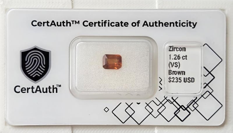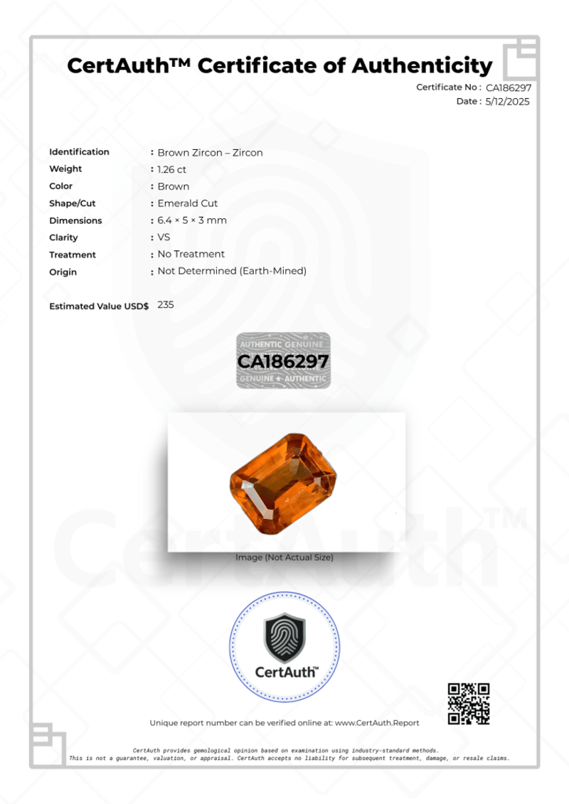 1.26 CT EMERALD CUT BROWN ZIRCON – VS CLARITY A Natural 1.26-Carat Brown Zircon Displaying Warm Brown Tones With Excellent Brilliance. This Emerald Cut Gemstone Features Clean Vs Clarity And Has Received No Treatment. An Earth-Mined Zircon, Securely Sealed In A Certauth™ Securecard And Accompanied By A Digital Certificate Of Authenticity.Details:• Gemstone: Brown Zircon – Zircon• Carat Weight: 1.26 Ct• Colour: Brown• Cut: Emerald Cut• Clarity: Vs• Treatment: No Treatment• Dimensions: 6.4 × 5 × 3 Mm• Origin: Not Determined (Earth-Mined)• Certification: Certauth Digital Certificate (No: Ca186297)• Estimated Value: $235 UsdNote: The Gemstone Is Securely Sealed In Original Certauth™ Securecard Packaging. Condition: Good - Refer Images 0488440+12