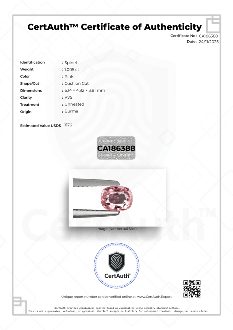 1.005 CT CUSHION CUT PINK SPINEL – VVS CLARITY A Natural 1.005-Carat Pink Spinel Displaying A Soft, Elegant Pink Hue. This Cushion Cut Gemstone Features Exceptional Vvs Clarity And Is Completely Unheated. Originating From Burma, This Earth-Mined Spinel Is Securely Sealed In A Certauth™ Securecard And Accompanied By A Digital Certificate Of Authenticity.Details:• Gemstone: Spinel• Carat Weight: 1.005 Ct• Colour: Pink• Cut: Cushion Cut• Clarity: Vvs• Treatment: Unheated• Dimensions: 6.14 × 4.92 × 3.81 Mm• Origin: Burma• Certification: Certauth Digital Certificate (No: Ca186388)• Estimated Value: $1,176 UsdNote: The Gemstone Is Securely Sealed In Original Certauth™ Securecard Packaging. Condition: Good - Refer Images 0488440+15
