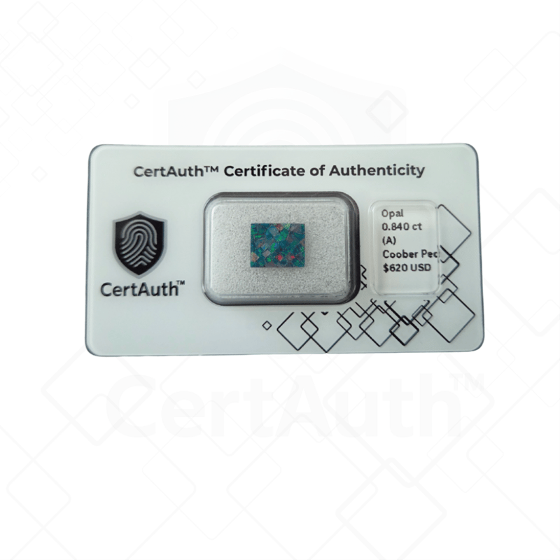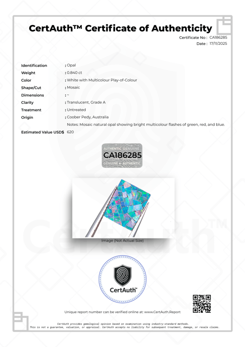 0.840 CT MOSAIC WHITE OPAL – COOBER PEDY, AUSTRALIA A Natural 0.840-Carat Mosaic Opal From Coober Pedy, Australia, Displaying Vivid Multicolour Play-Of-Colour. This White Opal Shows Bright Flashes Of Green, Red, And Blue Arranged In A Striking Mosaic Pattern. Graded As Translucent, Grade A, And Untreated, This Earth-Mined Opal Is Securely Sealed In A Certauth™ Securecard And Accompanied By A Digital Certificate Of Authenticity.Details:• Gemstone: Opal• Carat Weight: 0.840 Ct• Colour: White With Multicolour Play-Of-Colour• Cut: Mosaic• Clarity: Translucent, Grade A• Treatment: Untreated• Dimensions: Not Specified• Origin: Coober Pedy, Australia• Certification: Certauth Digital Certificate (No: Ca186285)• Estimated Value: $620 UsdNote: The Gemstone Is Securely Sealed In Original Certauth™ Securecard Packaging. Condition: Good - Refer Images 0488440+25