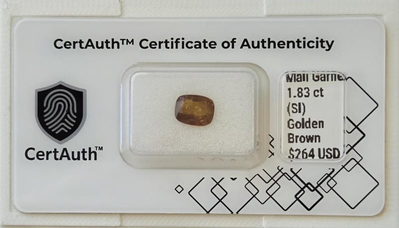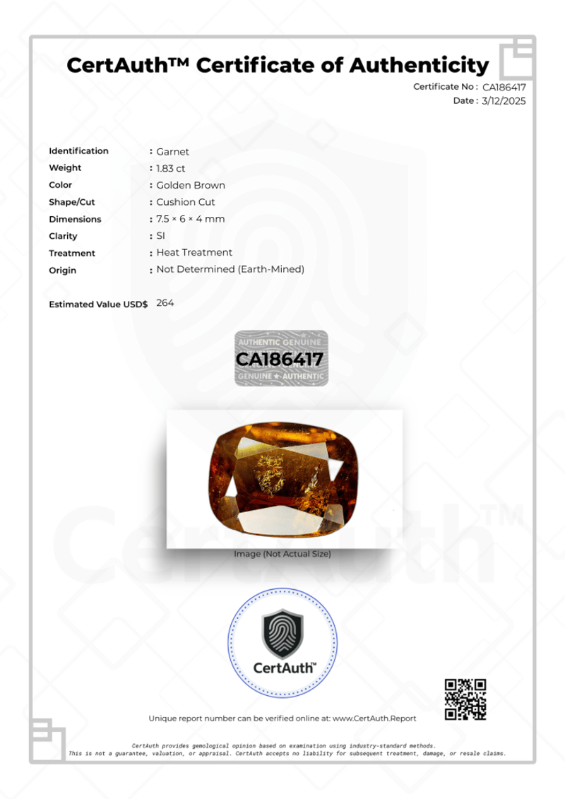 1.83 CT CUSHION CUT GOLDEN BROWN GARNET – HEATED A Natural 1.83-Carat Garnet Displaying A Warm Golden Brown Colour, Cut In A Classic Cushion Shape. The Gemstone Shows Si Clarity And Has Undergone Heat Treatment, A Commonly Accepted Enhancement For Colour Improvement. Earth-Mined With Origin Not Determined, And Accompanied By An Official Certauth™ Digital Certificate Of Authenticity.Details:• Gemstone: Garnet• Carat Weight: 1.83 Ct• Colour: Golden Brown• Cut: Cushion Cut• Clarity: Si• Treatment: Heat Treated• Dimensions: 7.5 × 6 × 4 Mm• Origin: Not Determined (Earth-Mined)• Certification: Certauth Digital Certificate (No: Ca186417)• Estimated Value: $264 UsdNote: Securely Sealed With Original Certauth™ Securecard And Digital Verification. Condition: Good - Refer Images 0488440+30