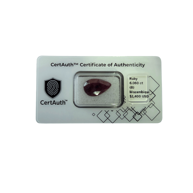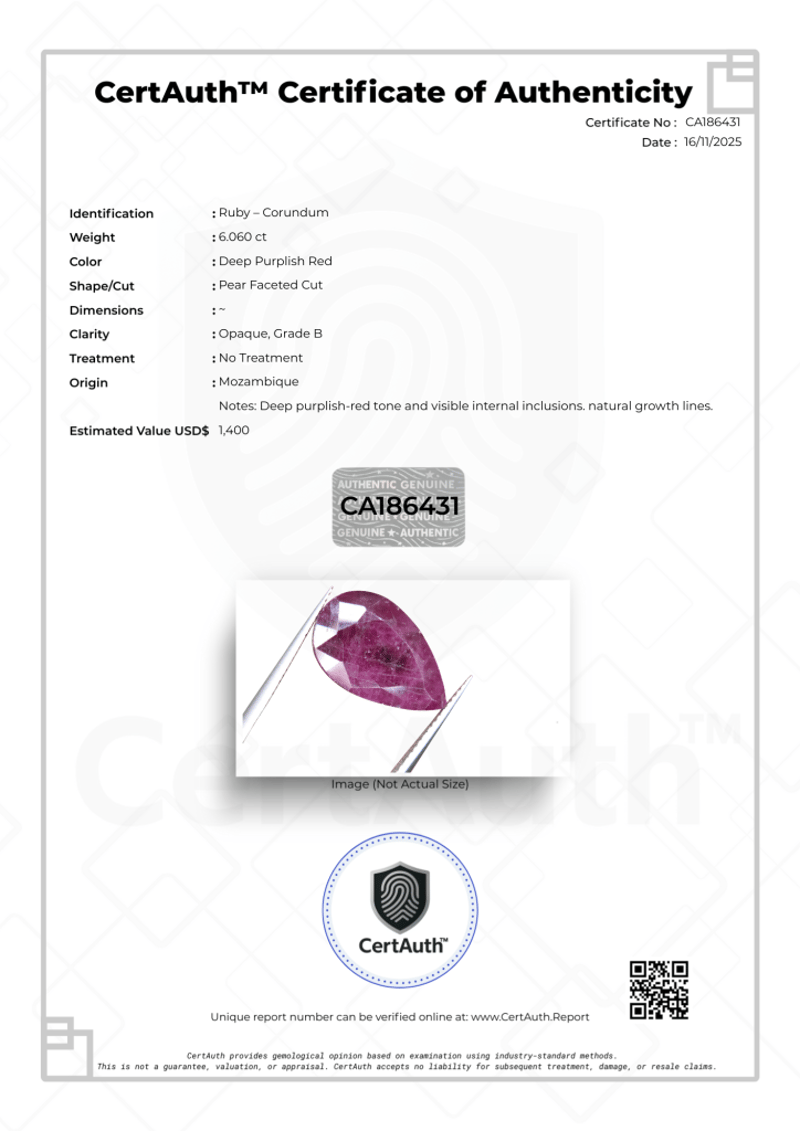 6.06 CT PEAR CUT DEEP PURPLISH RED RUBY – UNTREATED A Substantial 6.06-Carat Natural Ruby Displaying A Deep Purplish-Red Tone. This Pear-Faceted Gemstone Is Graded Opaque, Grade B, With Visible Internal Inclusions And Natural Growth Lines Consistent With Earth-Mined Material. Untreated, Preserving Its Natural Characteristics, And Authenticated With A Certauth™ Digital Certificate.Details:• Gemstone: Ruby – Corundum• Carat Weight: 6.06 Ct• Colour: Deep Purplish Red• Cut: Pear Faceted Cut• Clarity: Opaque, Grade B• Treatment: No Treatment• Dimensions: Not Specified• Origin: Mozambique• Certification: Certauth Digital Certificate (No: Ca186431)• Estimated Value: $1,400 UsdNote: Supplied Sealed In Original Certauth™ Securecard With Digital Verification. Condition: Good - Refer Images 0488440+36
