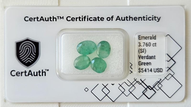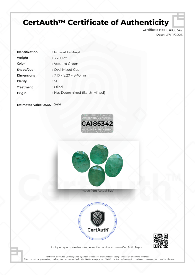 3.76 CT OVAL MIXED CUT EMERALD – NATURAL, OILED A Substantial 3.76-Carat Natural Emerald Displaying A Rich Verdant Green Colour. This Earth-Mined Gemstone Is Cut In An Oval Mixed Cut, Offering Balanced Brilliance And Depth. Typical Emerald Inclusions Are Present, Consistent With Si Clarity, And The Stone Has Been Oiled To Enhance Appearance. Authenticated With A Certauth™ Digital Certificate.Details:• Gemstone: Emerald – Beryl• Carat Weight: 3.760 Ct• Colour: Verdant Green• Cut: Oval Mixed Cut• Dimensions: 7.10 × 5.20 × 3.40 Mm• Clarity: Si• Treatment: Oiled• Origin: Not Determined (Earth-Mined)• Certification: Certauth™ Digital Certificate (No: Ca186342)• Estimated Value: $541 UsdNote: Supplied Sealed In Original Certauth™ Securecard With Digital Verification. Condition: Good - Refer Images 0488440+40