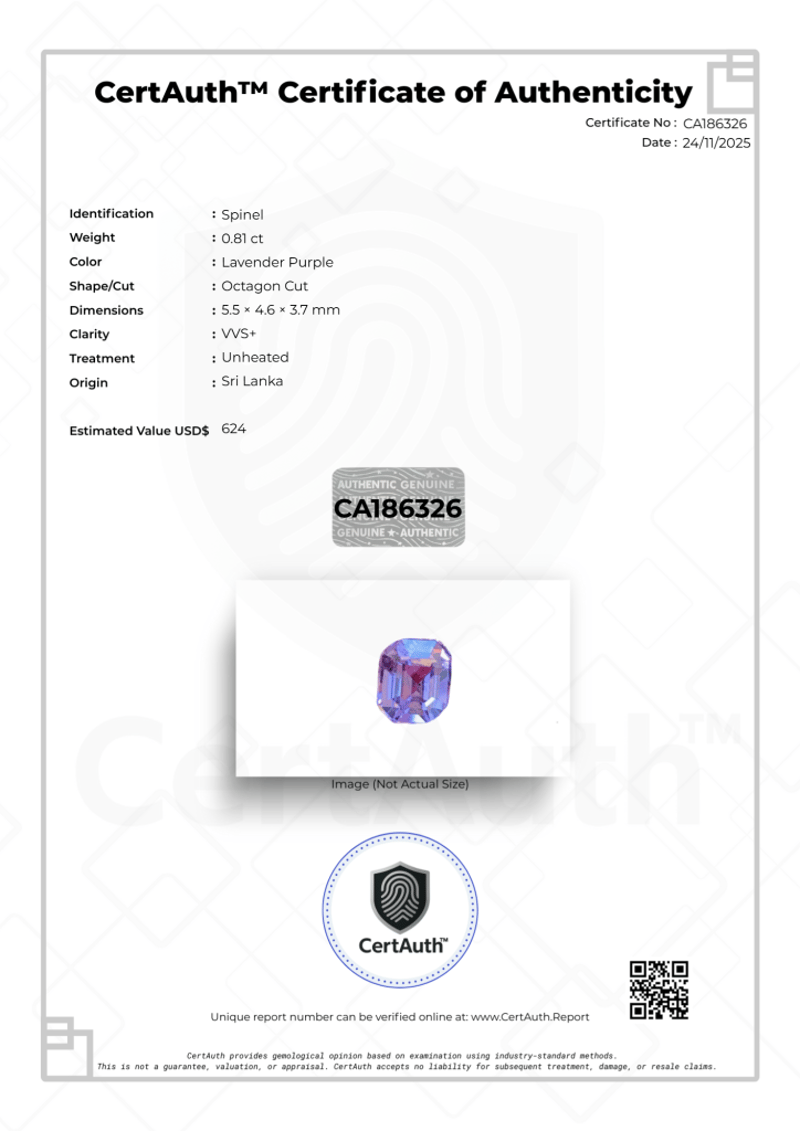 0.81 CT OCTAGON CUT LAVENDER PURPLE SPINEL – UNHEATED A Refined 0.81-Carat Natural Spinel Displaying An Elegant Lavender Purple Hue. This Gemstone Is Precision Cut In An Octagon Shape, Delivering Sharp Facet Symmetry And Excellent Brilliance. Unheated And Earth-Mined, It Offers Outstanding Clarity And Natural Colour, Verified With A Certauth™ Digital Certificate.Details:• Gemstone: Spinel• Carat Weight: 0.81 Ct• Colour: Lavender Purple• Cut: Octagon Cut• Dimensions: 5.5 × 4.6 × 3.7 Mm• Clarity: Vvs+• Treatment: Unheated• Origin: Sri Lanka• Certification: Certauth™ Digital Certificate (No: Ca186326)• Estimated Value: $624 UsdNote: Supplied Sealed In Original Certauth™ Securecard With Digital Verification. Condition: Good - Refer Images 0488440+42