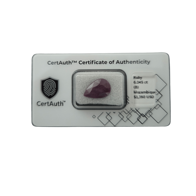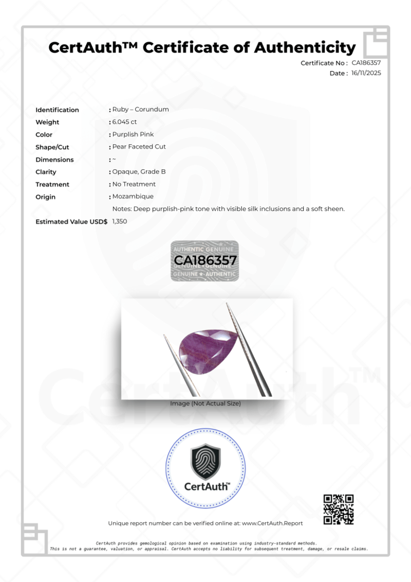 6.05 CT PEAR CUT PURPLISH PINK RUBY – UNTREATED A Substantial 6.045-Carat Natural Ruby Featuring A Deep Purplish-Pink Tone And Classic Pear-Faceted Cut. This Earth-Mined Mozambique Ruby Is Untreated And Displays Visible Silk Inclusions That Create A Soft Sheen Across The Surface, Giving The Stone Character And Depth. Authenticated And Sealed With A Certauth™ Digital Certificate.Details:• Gemstone: Ruby – Corundum• Carat Weight: 6.045 Ct• Colour: Purplish Pink• Cut: Pear Faceted Cut• Dimensions: Not Stated• Clarity: Opaque, Grade B• Treatment: No Treatment• Origin: Mozambique• Certification: Certauth™ Digital Certificate (No: Ca186357)• Estimated Value: $1,350 UsdNote: Securely Sealed In Original Certauth™ Securecard With Digital Verification. Condition: Good - Refer Images 0488440+44
