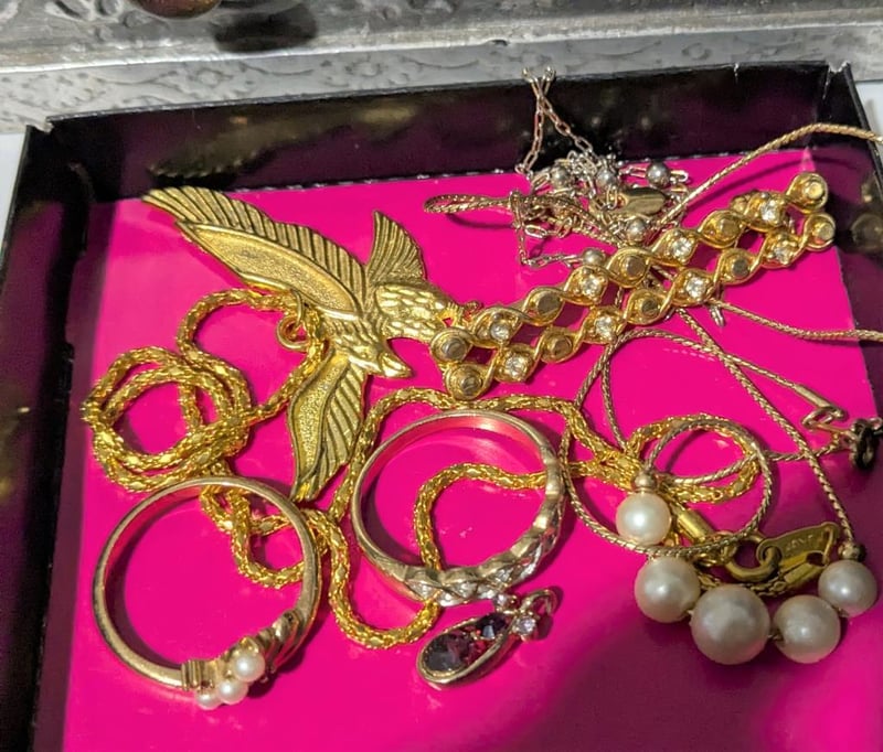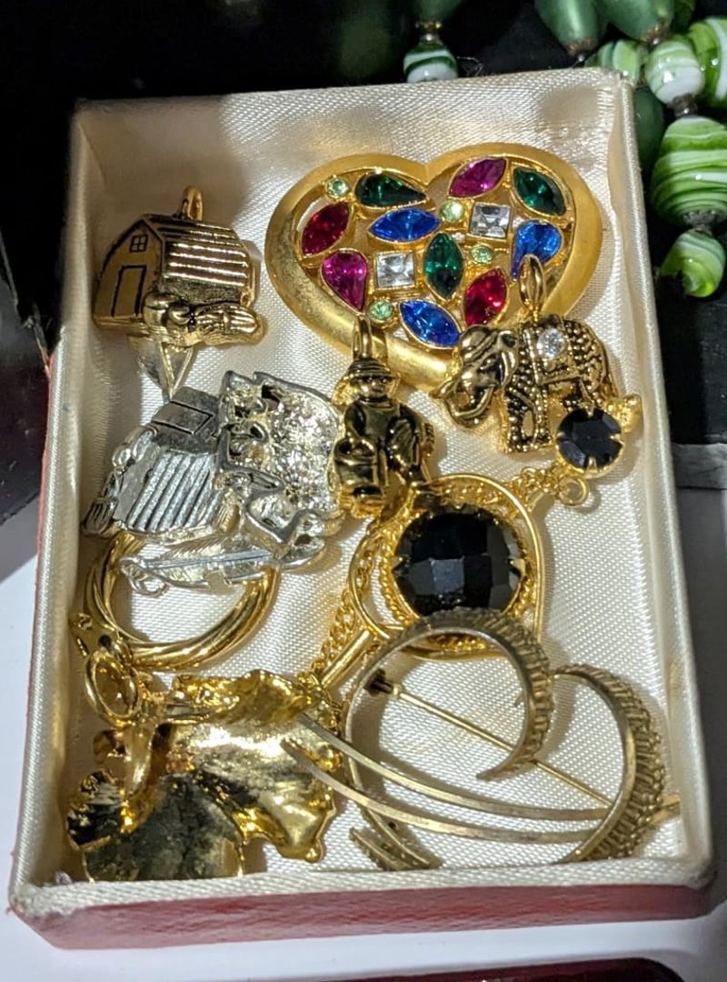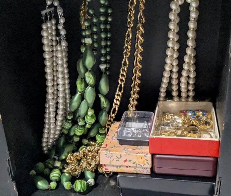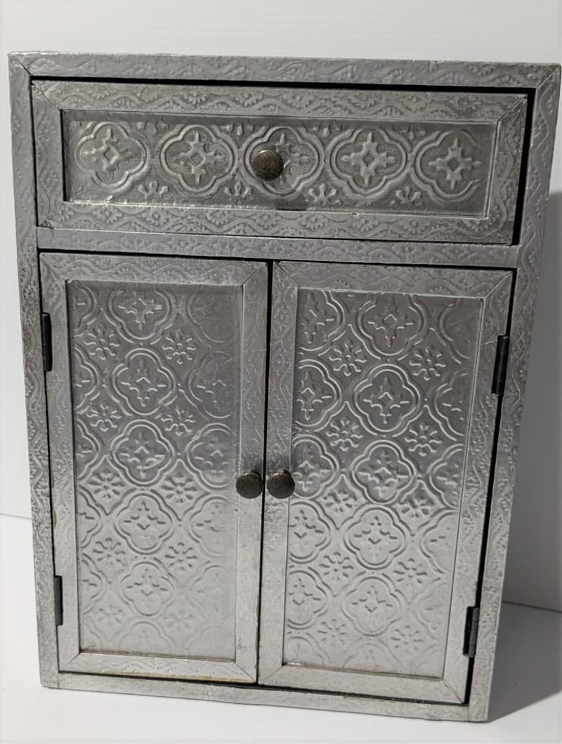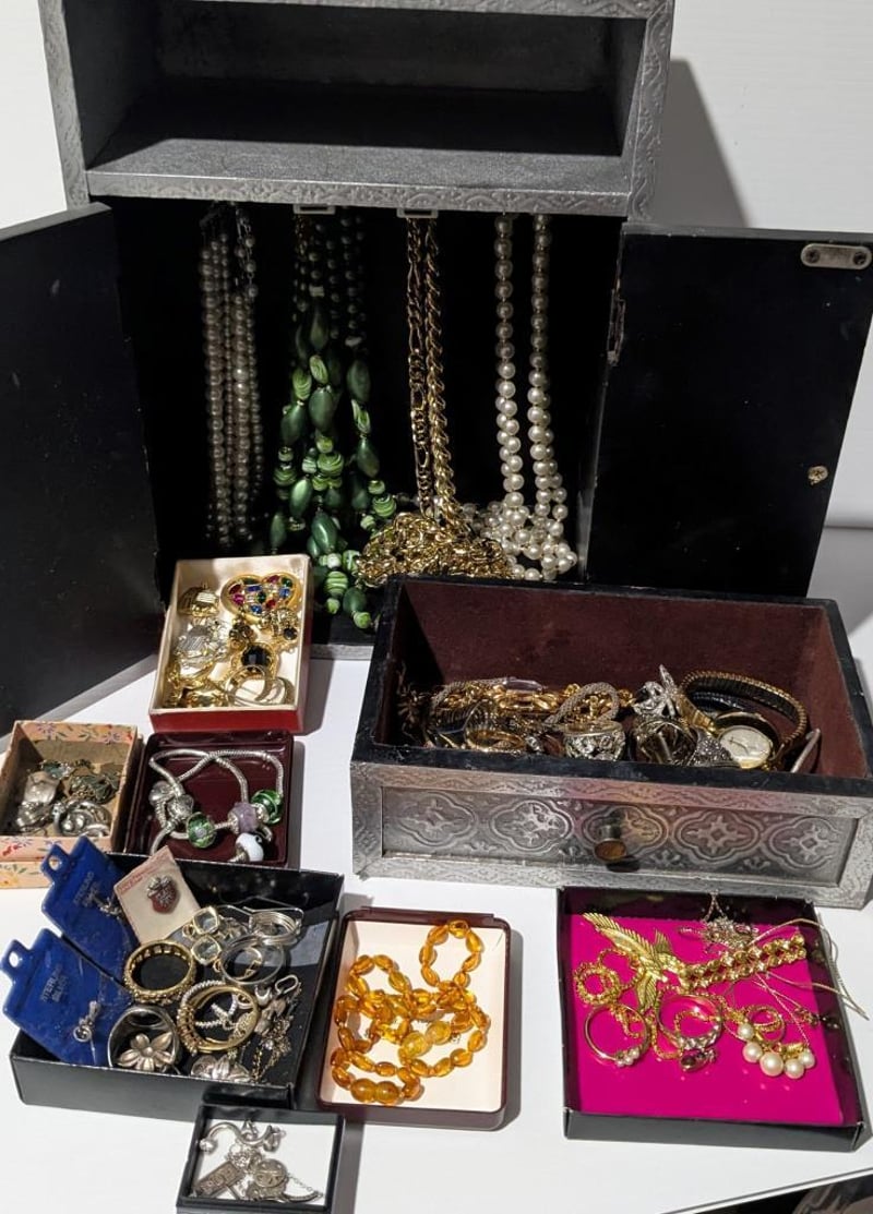 ASSORTED JEWELLERY IN PRESSED METAL CUPBOARD STYLE JEWELLERY BOX