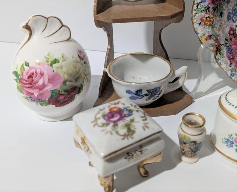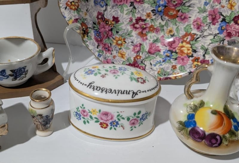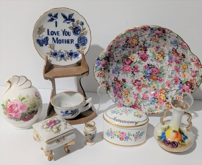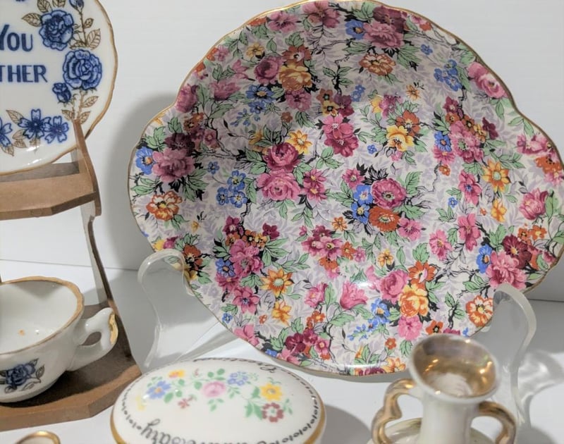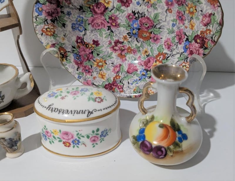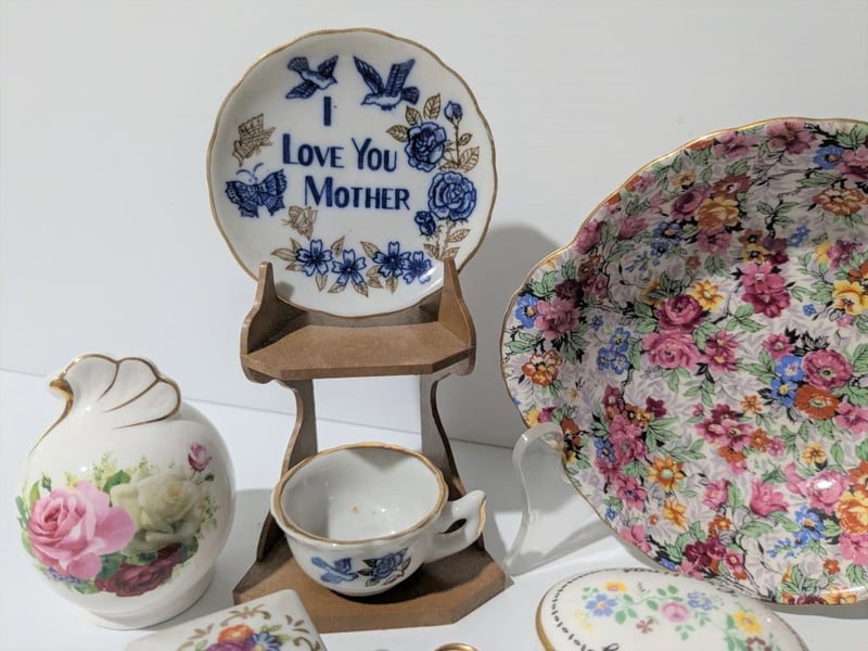 Incl Chintz Pin Dish Marina England, Staffordshire Lidded Anniversary Dish, Hand Painted Vases & Mother Cup & Saucer