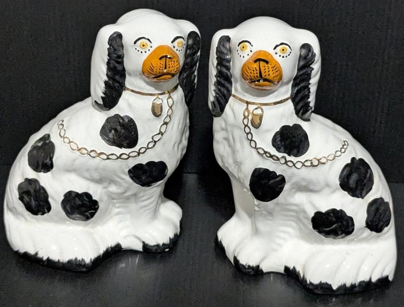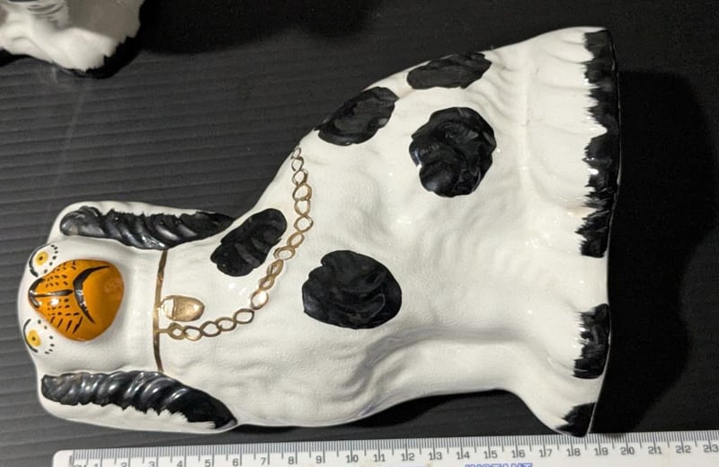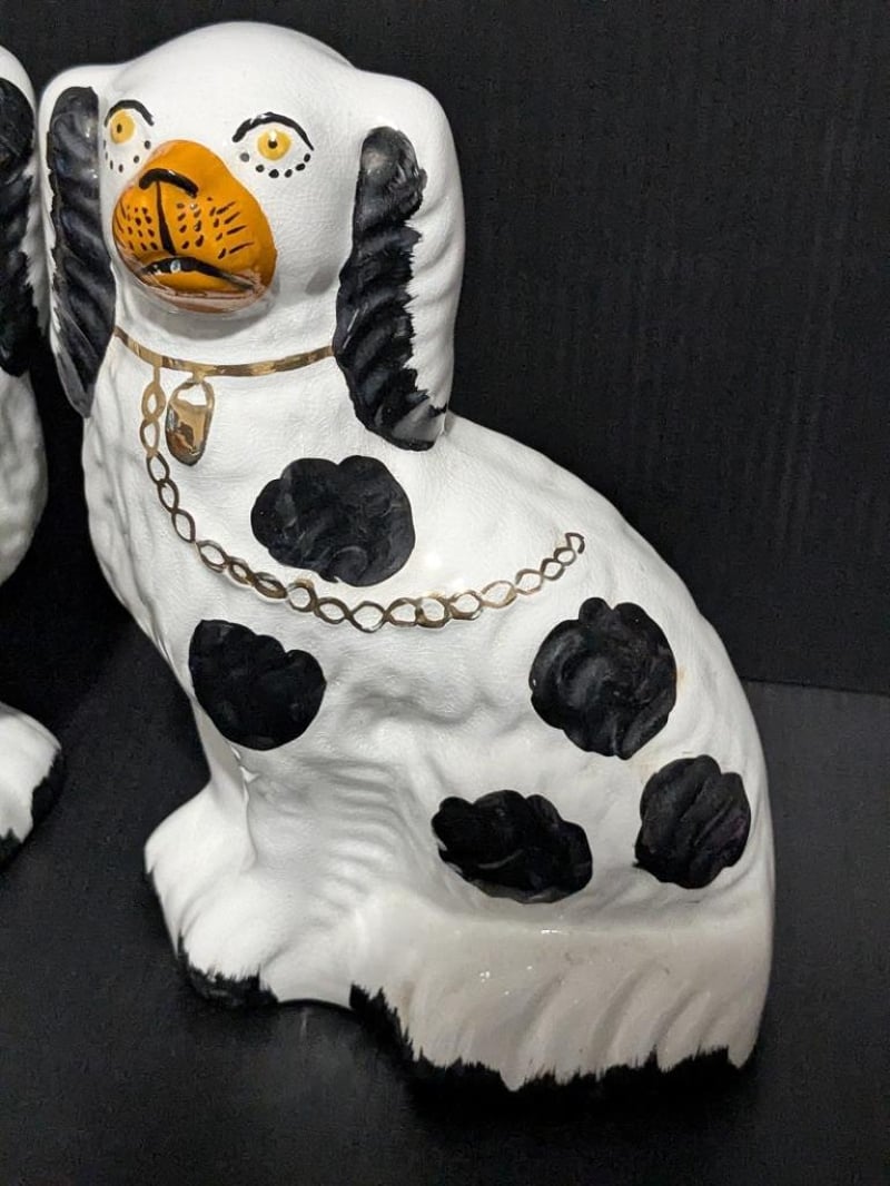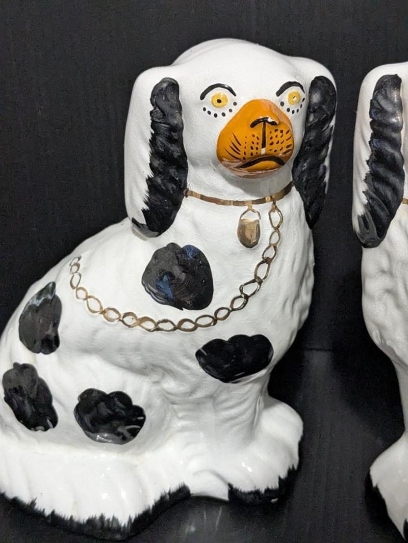 PAIR OF STAFFORDSHIRE STYLE SPANIEL DOG FIGURINES 20Cm Tall, Small Gold Mark On Base Of Each, Some Crazing And Slight Paint Loss Of Noses Condition: Good - Refer Images 0 586354+1