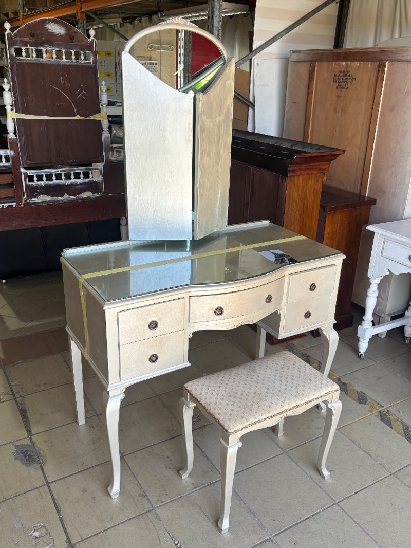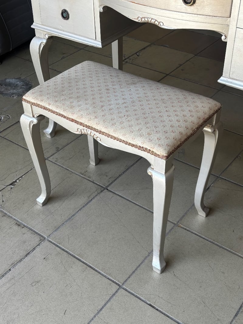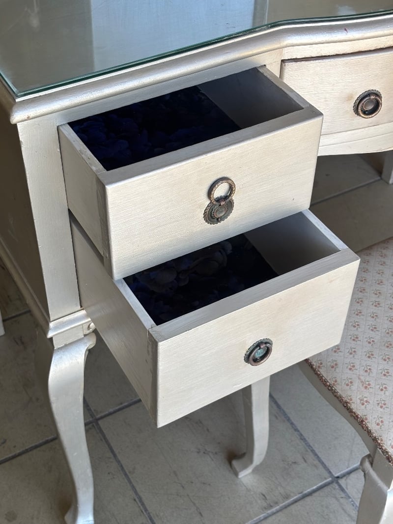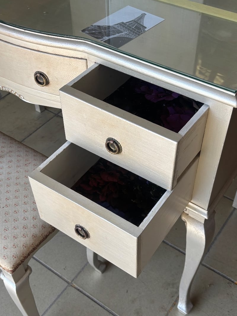 Wooden Table Dresser with Mirror and Draws, French Provincial Style, Metal Handles, Seat is paired with the table, Mirror Cover