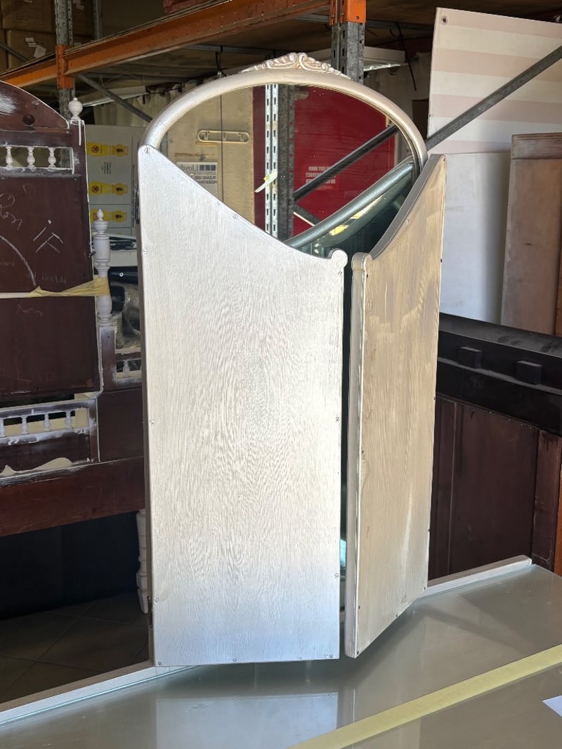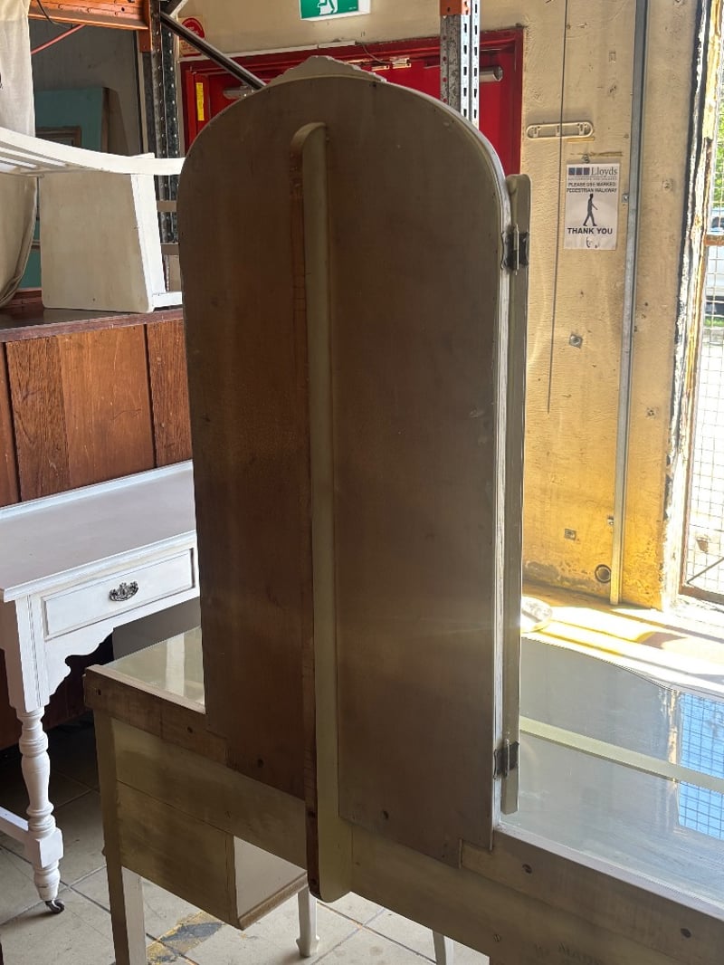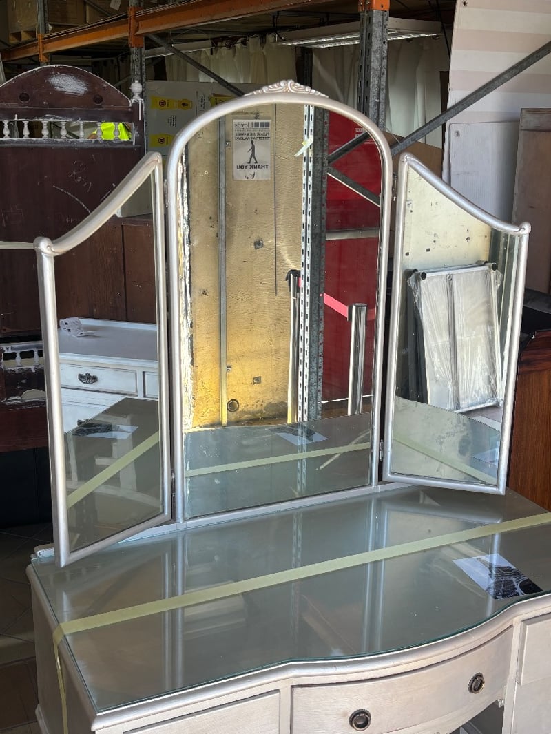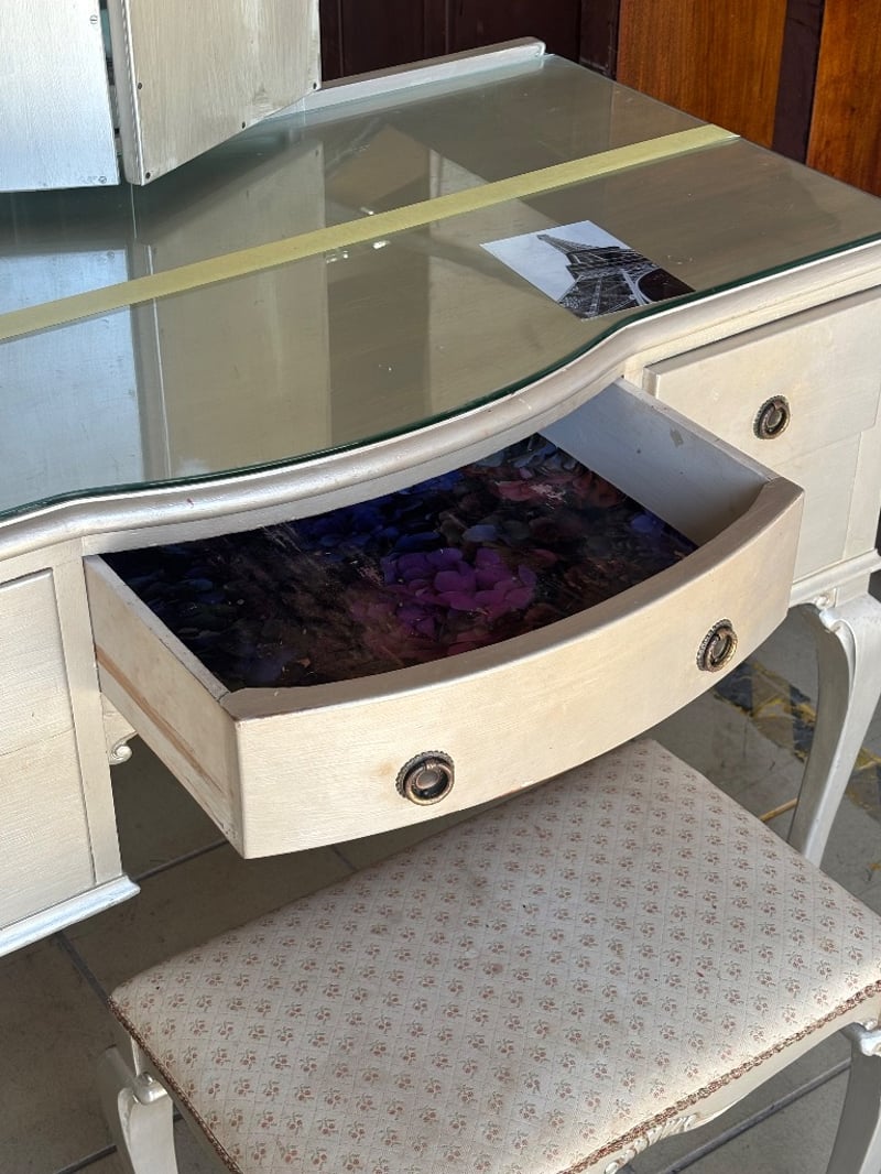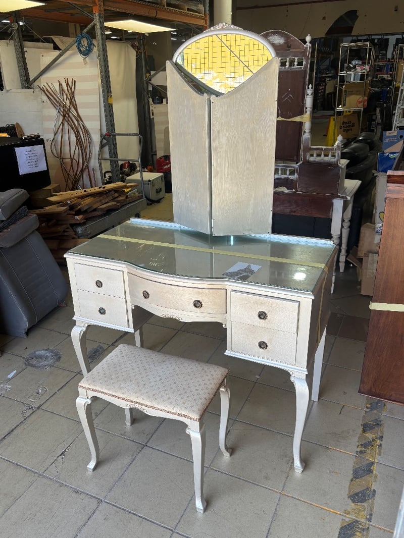 Wooden Table Dresser with Mirror and Draws, French Provincial Style, Metal Handles, Seat is paired with the table, Mirror Cover