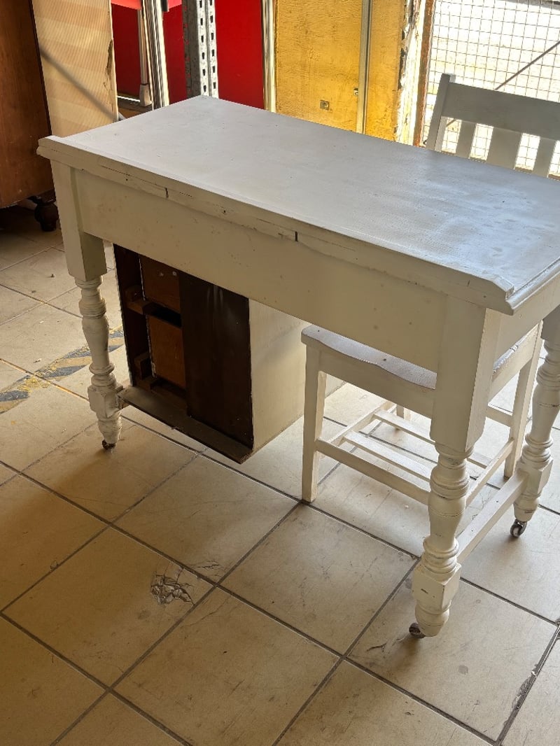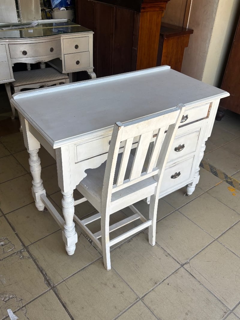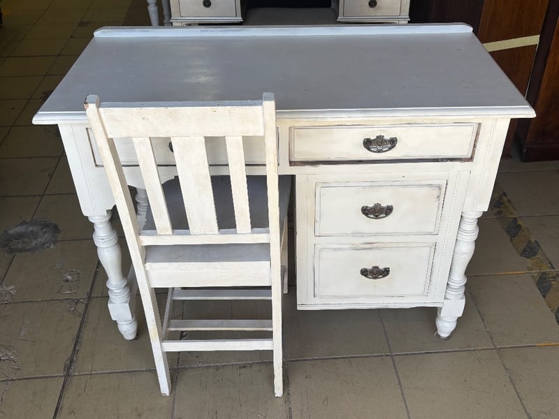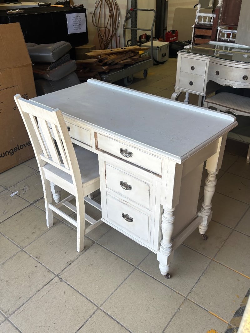 Wooden French Provincial Styled Desk with Chair, Metal Handles, White Matt Finish, Legs on Wheels, Marks and Scratches