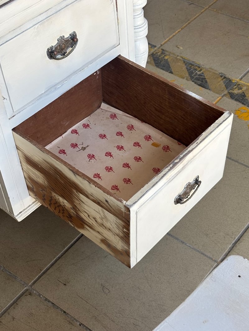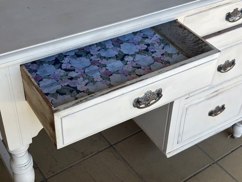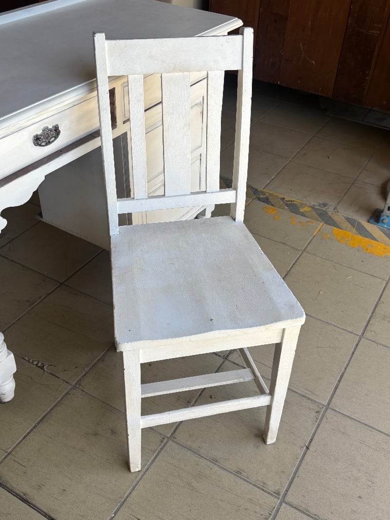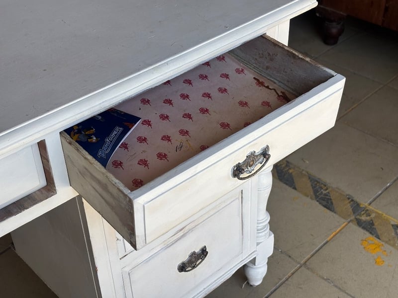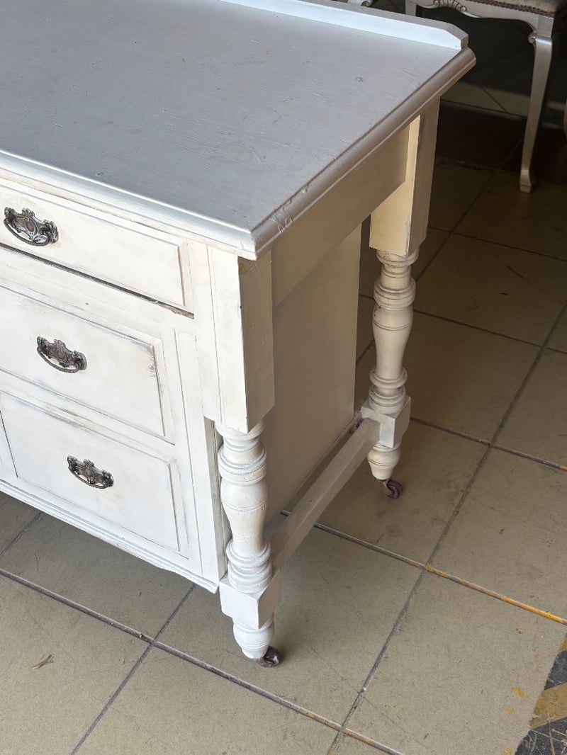 Wooden French Provincial Styled Desk with Chair, Metal Handles, White Matt Finish, Legs on Wheels, Marks and Scratches
