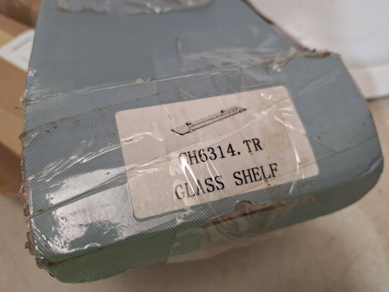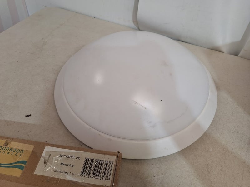 Includes two shower arm assemblies, one white dome-shaped ceiling fixture/cover, and one glass shelf unit